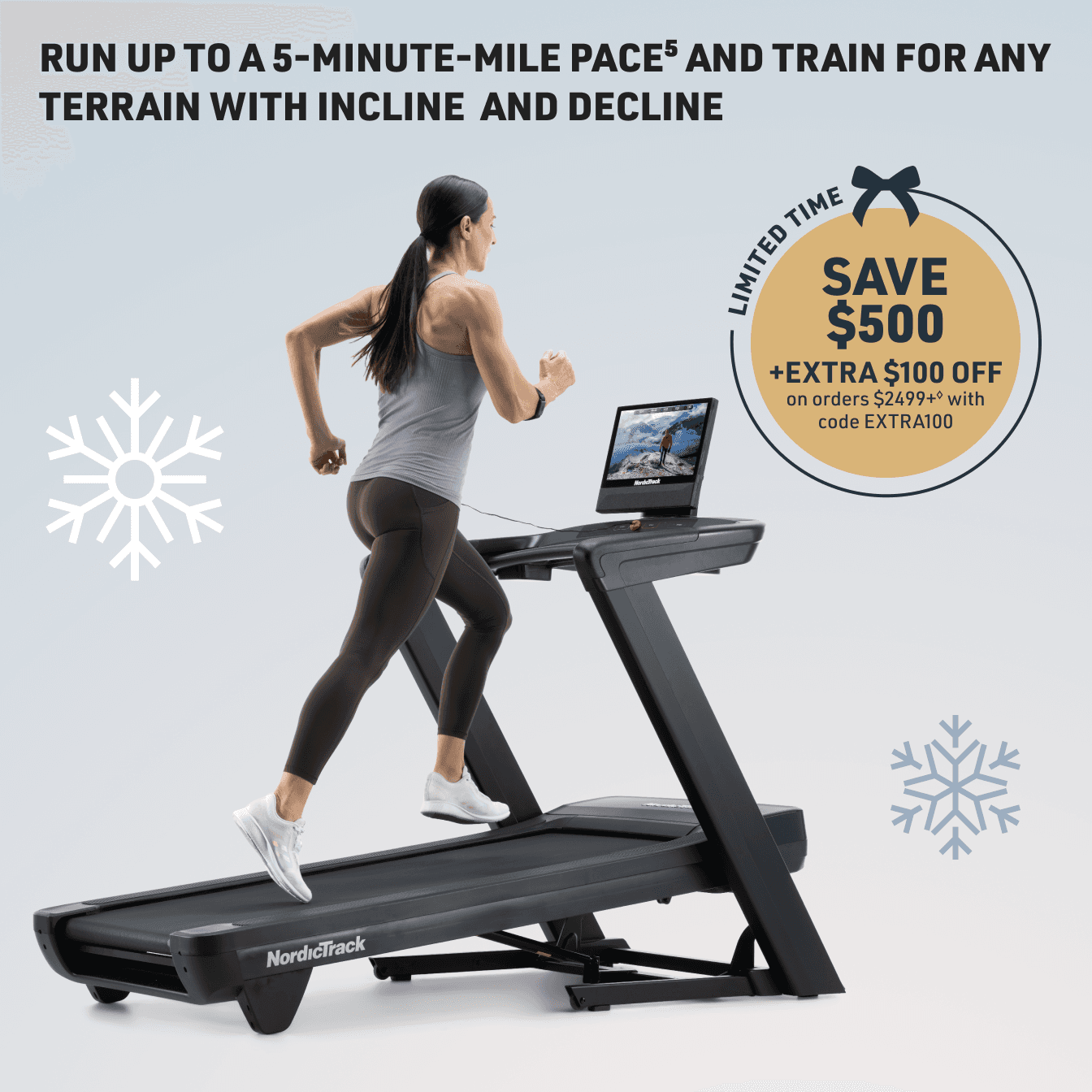 ◊Extra $100 off orders $2,499+ offer (“Offer”) available December 23, 2025 through December 25, 2025 until 11:59PM MST for U.S. residents, 18+. Discount only applies to the subtotal of order at Home and Exercise Equipment by NordicTrack - Treadmills, Ellipticals, and More and will not apply to taxes or shipping or other charges. Offer is not transferable, substitutable, not redeemable for cash or account credit, has no cash value, and will not be applied retroactively. Void where prohibited. Must enter EXTRA100 promo code at checkout to obtain discount. Limit one per customer. Offer excludes Ultra Series products. NordicTrack reserves the right to end, revise, modify, or extend this Offer or its terms at any time without notice. NordicTrack is not responsible for any Offer errors, including tech errors.