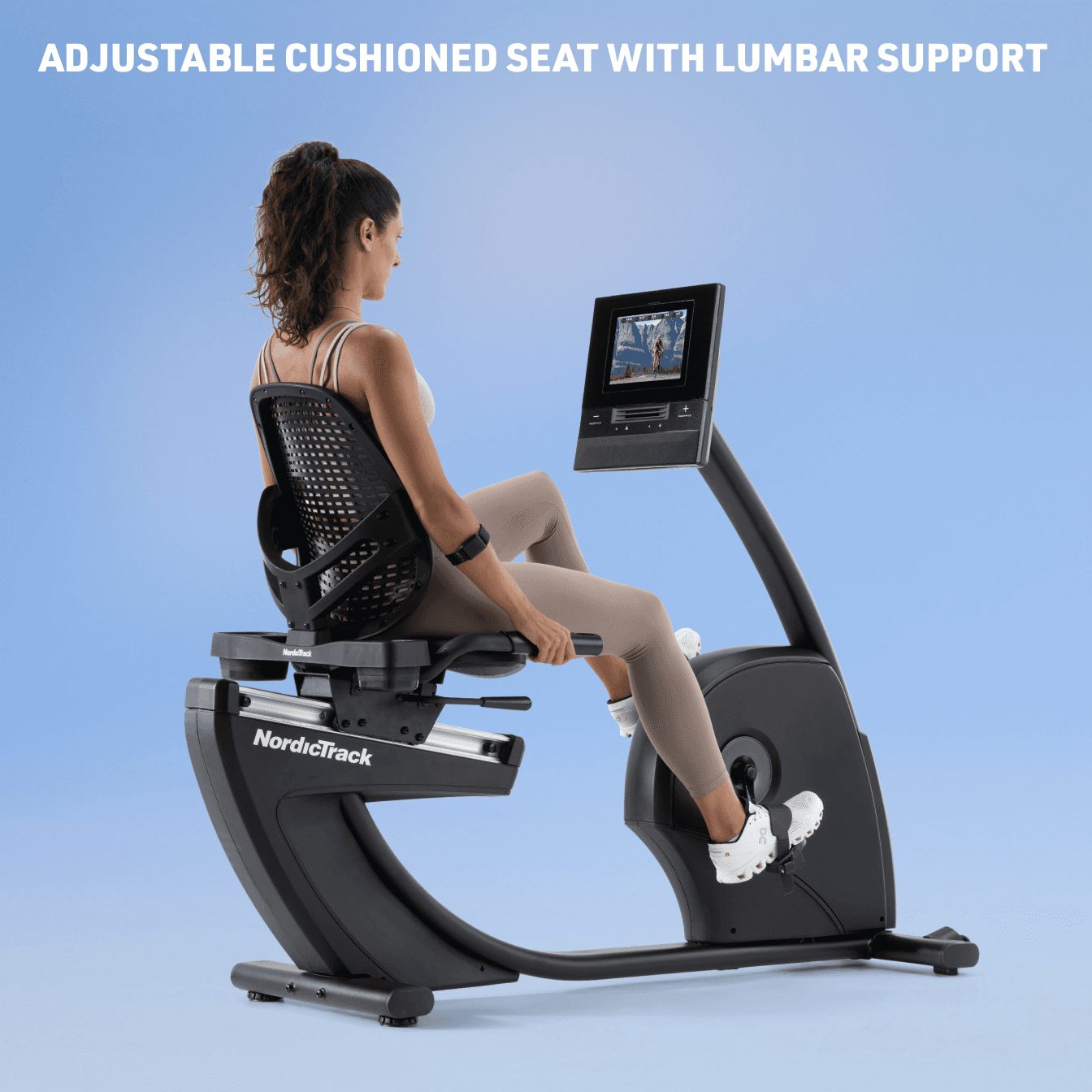 Stay comfortable while you workout. A cushioned seat with lumbar support that adjusts so you can easily reach the pedals.