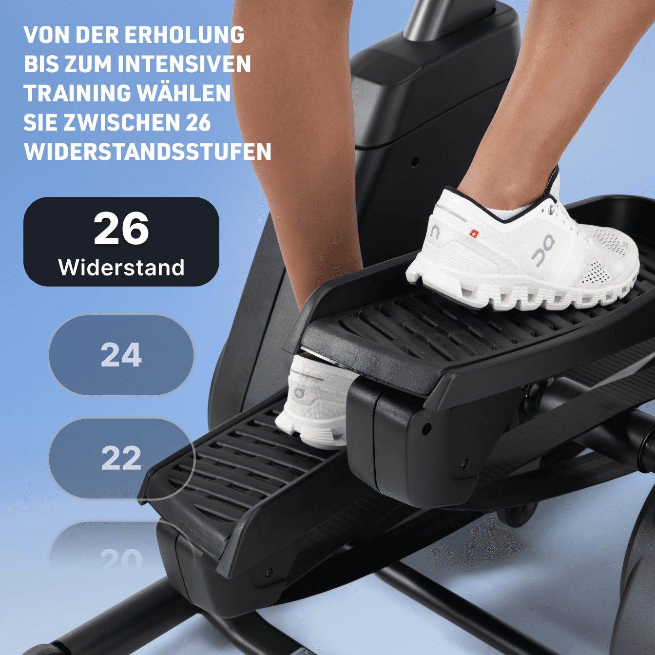 26 Stufen des digitalen Widerstands liefern das richtige Training, das Ihr Körper braucht. Von der Erholung bis zur hohen Intensität können Sie den digitalen Widerstand wählen, den Sie benötigen, um Ihre Ziele zu erreichen.