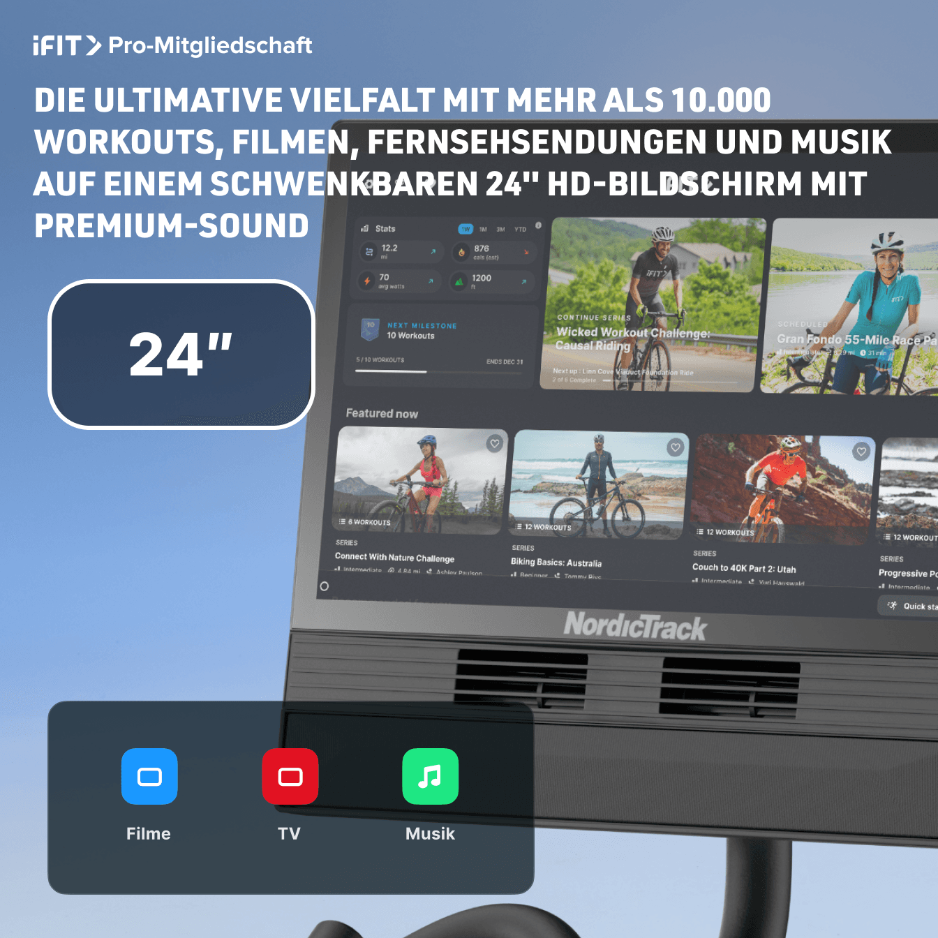 Mit iFIT haben Sie Zugriff auf Streaming-Dienste direkt auf dem 24'' HD-Touchscreen. Schwenken und neigen Sie den Bildschirm für den perfekten Betrachtungswinkel und trainieren Sie zu Ihren Lieblingsfilmen, -shows und -musik.⁶