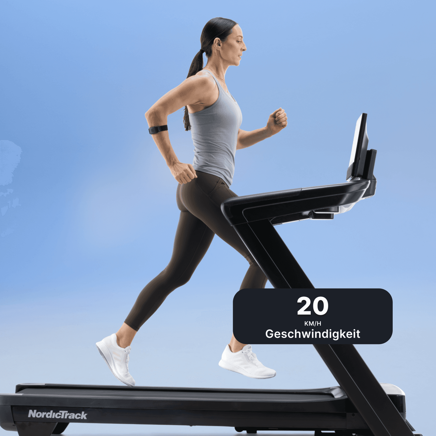 Dies ist unser schnellstes Laufband. Laufen Sie dank unseres 4,25-CHP-Motors⁴ bis zu 20 KM PRO STUNDE (3-Minuten-Km-Tempo⁵).