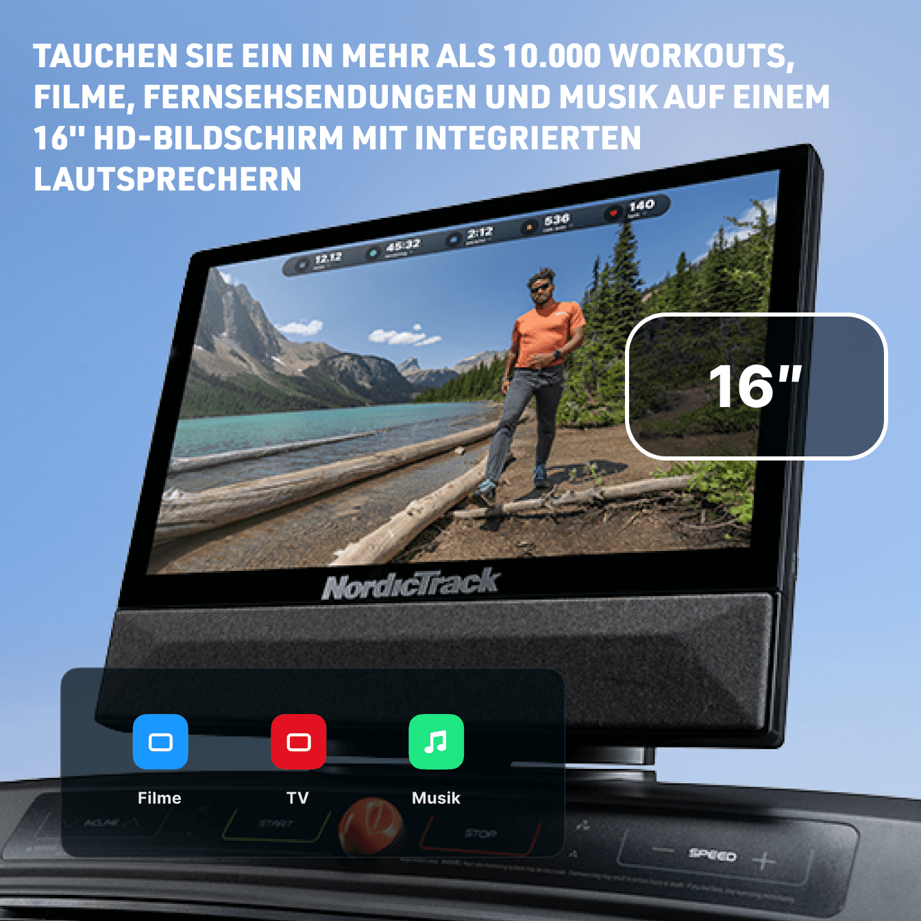 Mit iFIT haben Sie Zugriff auf Streaming-Dienste direkt auf dem 16'' HD Touchscreen. Schwenken und neigen Sie den Bildschirm für den perfekten Betrachtungswinkel und trainieren Sie zu Ihren Lieblingsfilmen, -shows und -musik.⁶