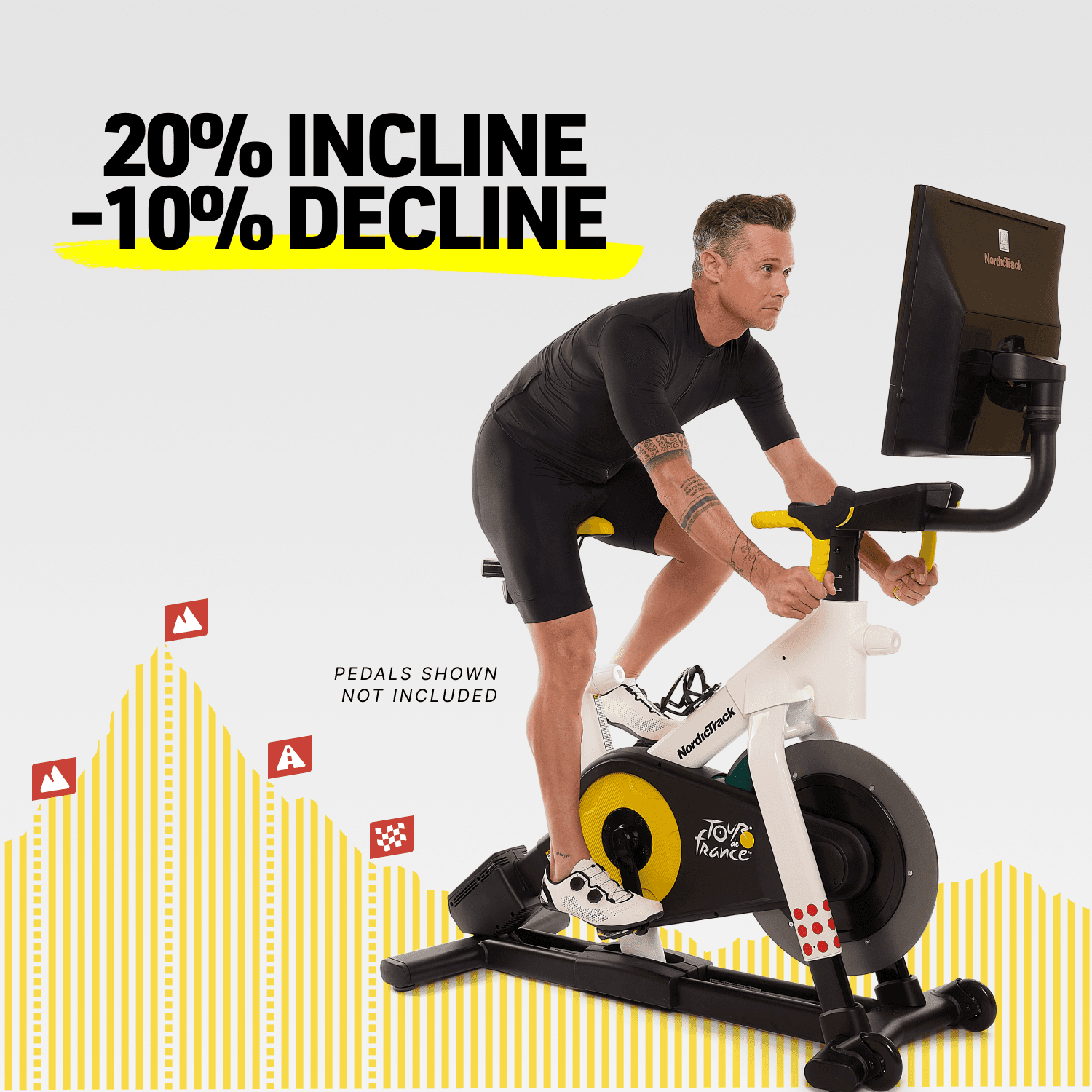 Simulates grade changes by automatically raising and lowering the bike up to 20% incline and -10% decline.