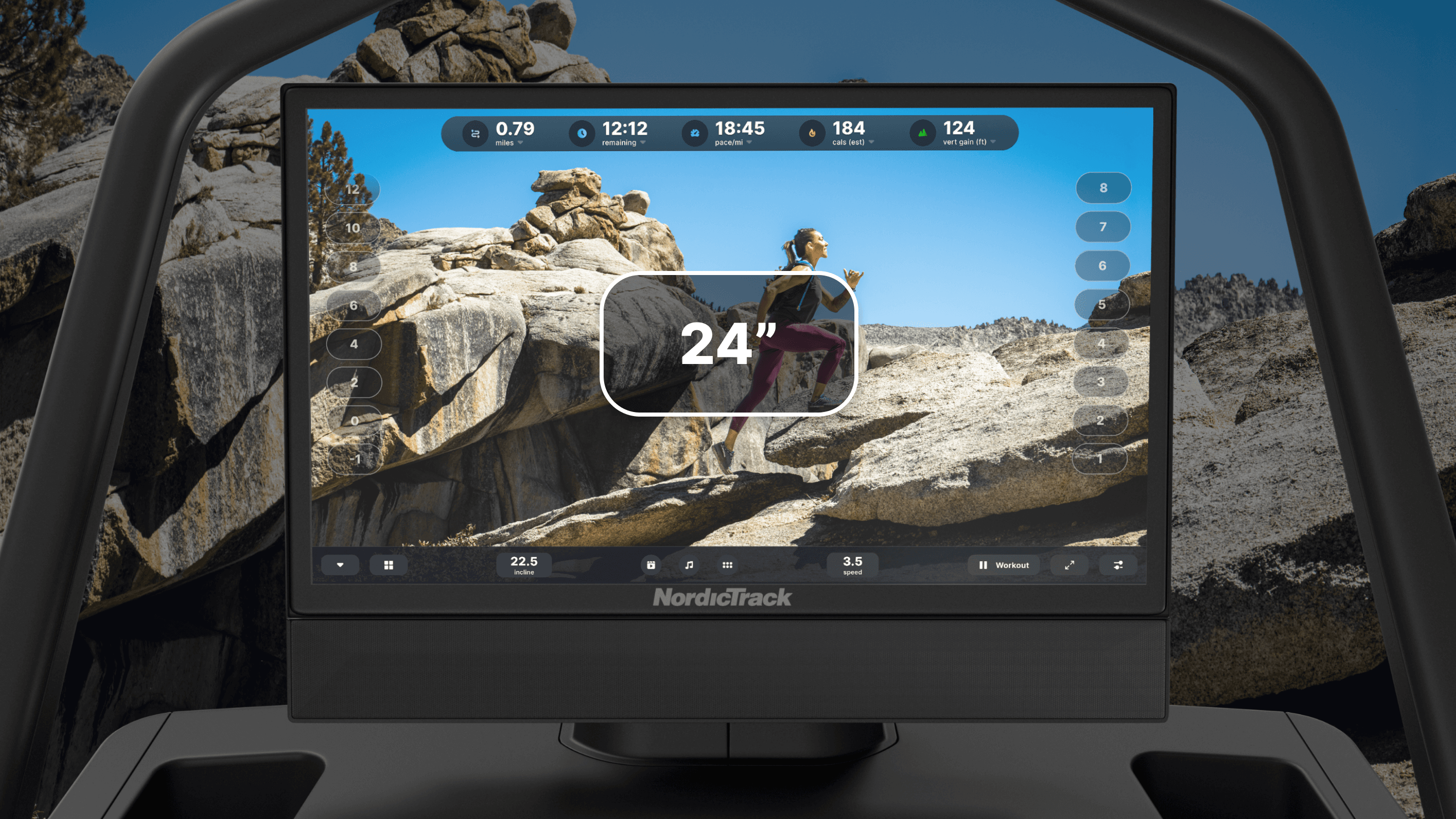 Pivoting 24" (61.0 cm) touchscreen for off-equipment workouts