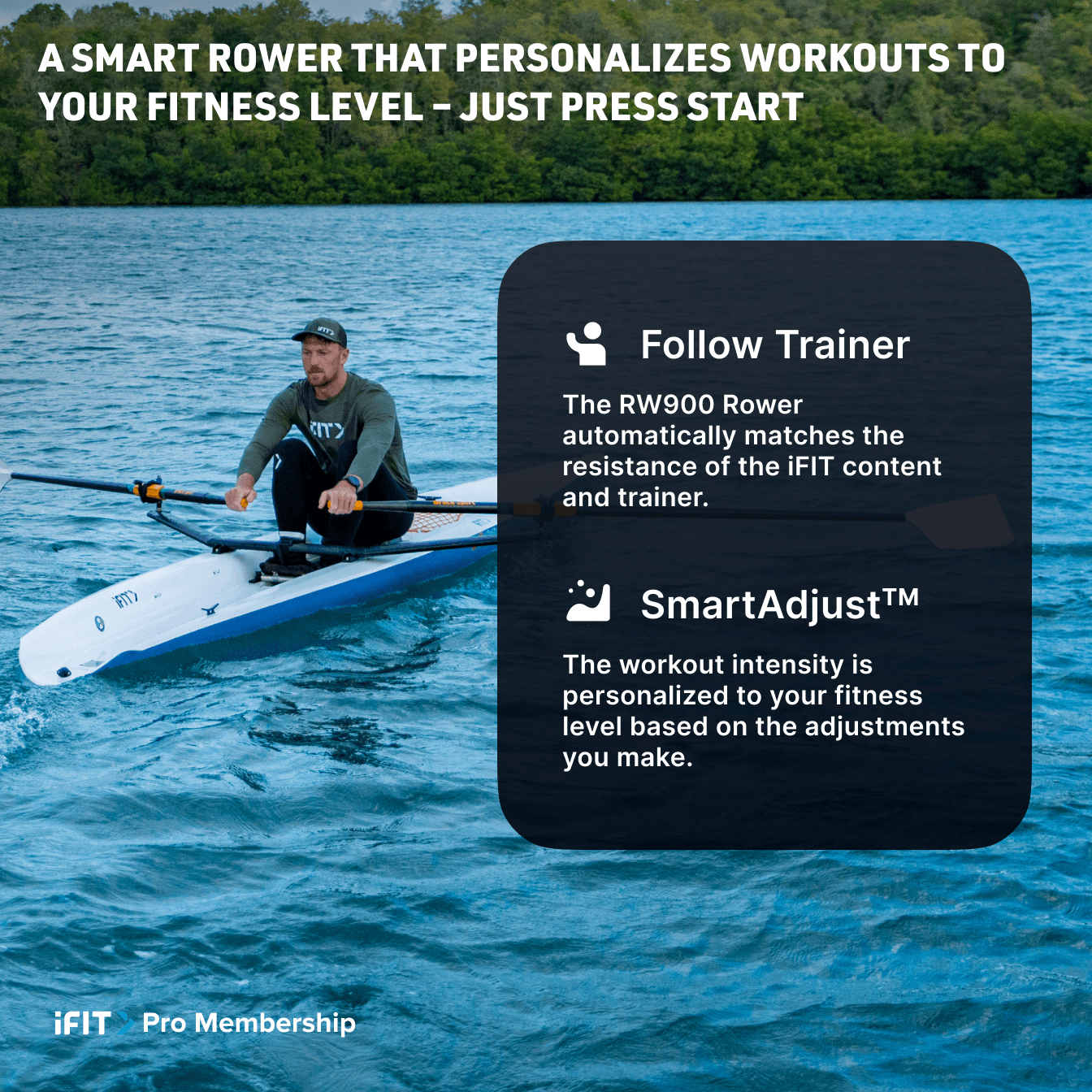 Wide pedals with adjustable straps to fit most shoe sizesTHE RW900 SMART ROWER ADJUSTS TO YOU. JUST PRESS START AND IFIT DOES THE REST.¹