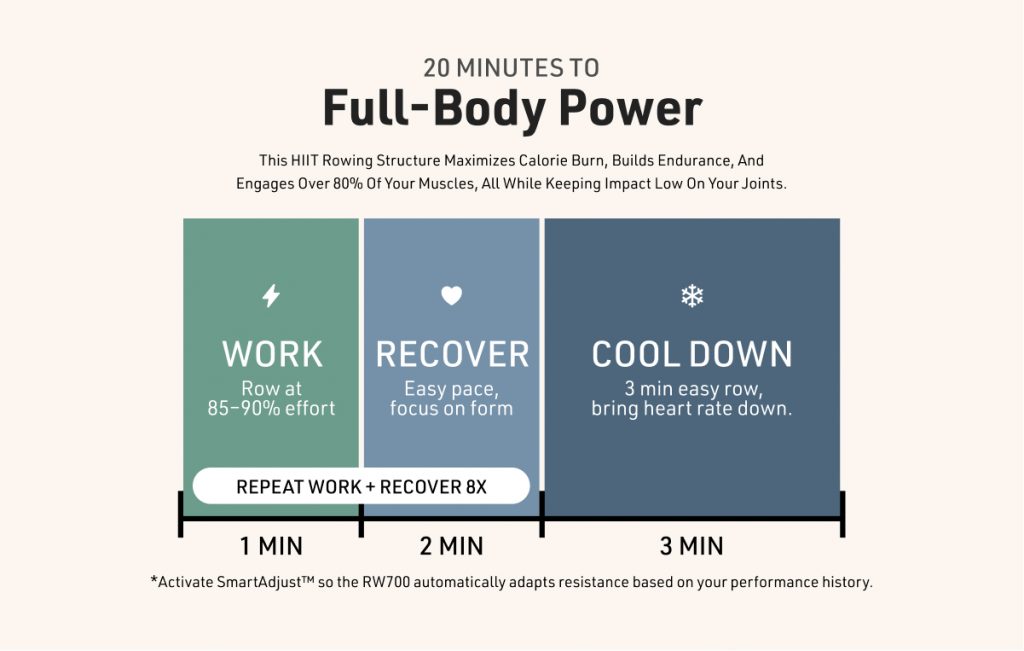 High-intensity interval training (HIIT) is particularly effective on rowing machines because it mirrors the energy system demands observed in competitive rowing: short bursts of explosive power, followed by partial recovery. Elite rowers have been shown to sustain mechanical power outputs up to 590 W during racing², highlighting the sport’s demand for repeated anaerobic effort.