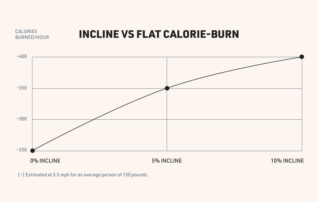 Walking on an incline recruits more muscles in your glutes, hamstrings, quads, and calves2. It also elevates your heart rate more quickly than walking on a flat surface at the same speed. Just a 5% to 10% incline can significantly change how your workout feels and boost your calorie burn1.