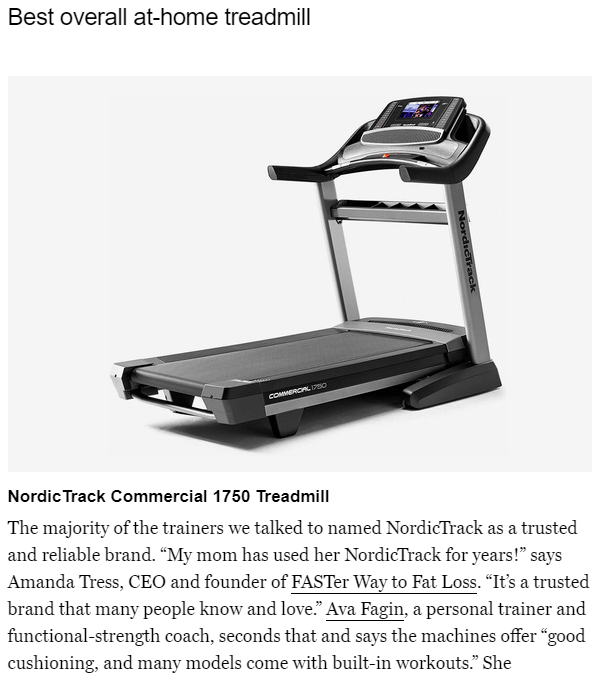 We feel honored to have made the list of top home treadmills from New York Magazine online. Their ecommerce product column, The Strategist, recently assembled a list of the best home treadmills recommended by personal trainers, and the NordicTrack Commercial 1750 made the list as “Best Overall At-Home Treadmill”.