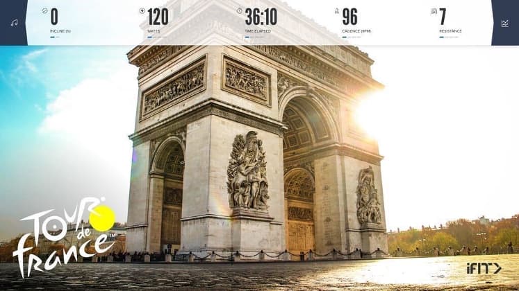 The iFIT and Tour de France® series includes all 21 stages of the race, with a total distance of 2,220.5 miles (3573.54 km) broken down into 112 workouts, so you’re able to ride at your own pace. The race route begins in Nice and ends in Paris, with a total of six regions and 32 departments travelled through by the race's conclusion.