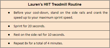 Lauren: "I hate to say this, but squashing boredom is a huge step in keeping up a successful treadmill workout. These great machines are so versatile these days and offer so much more than they ever have, but mile after mile staring at the wall in front of you can still be kind of a buzzkill. Here are a few ways I’ve learned to beat the boredom: