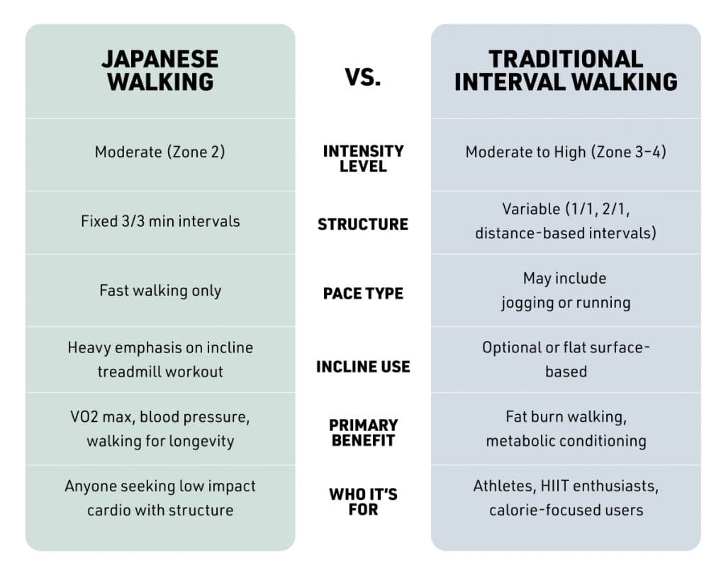 Japanese walking is a performance-forward approach to incline interval walking. Though not officially named in academic literature, it gained viral attention due to its structured format—alternating brisk and recovery-paced walking on an incline treadmill for about 30 minutes total.