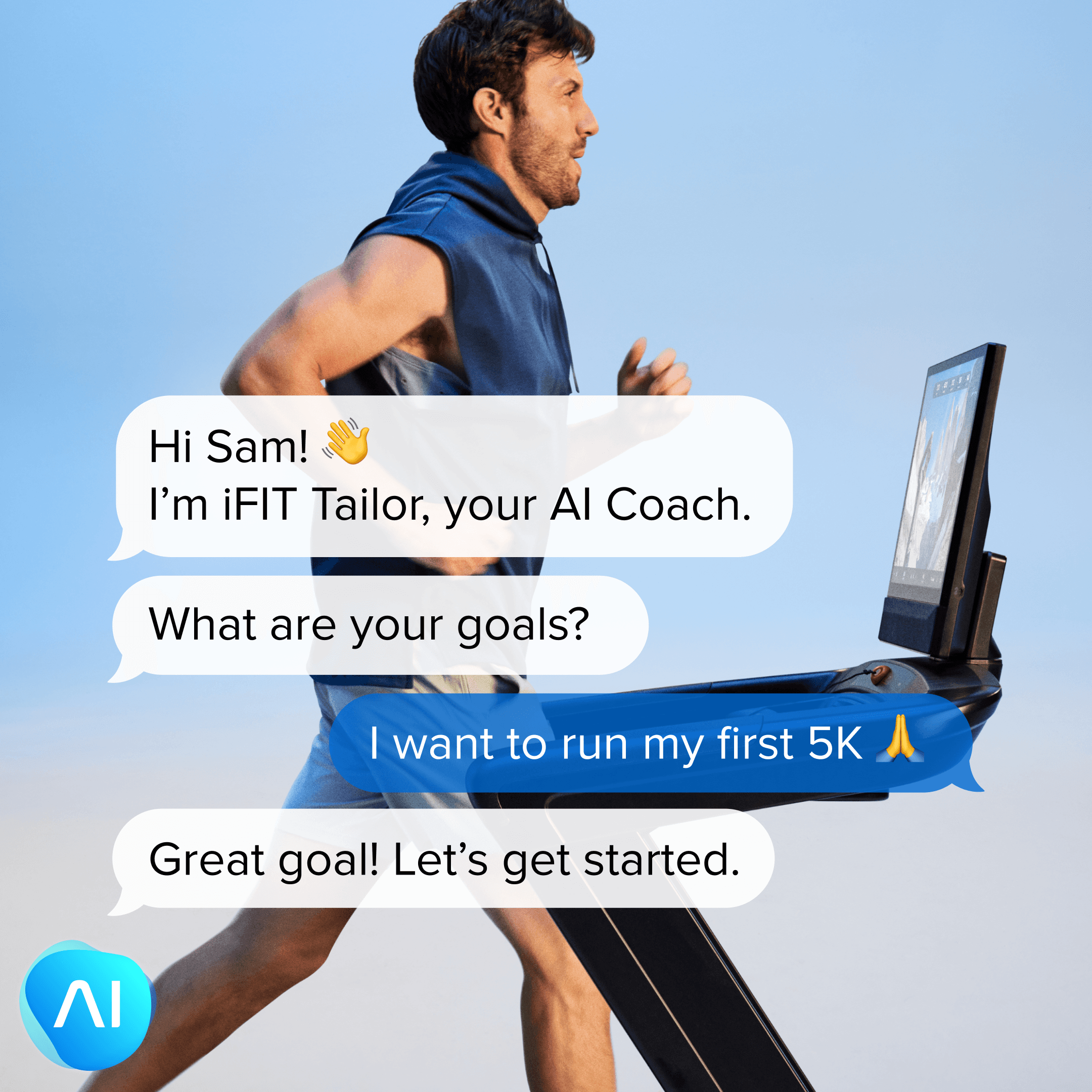 AI Coach works with you directly through texting. Once a plan is set, it will schedule your workouts for you and sync them with your treadmill automatically. It tracks your progress and keeps you motivated to stick to the plan.