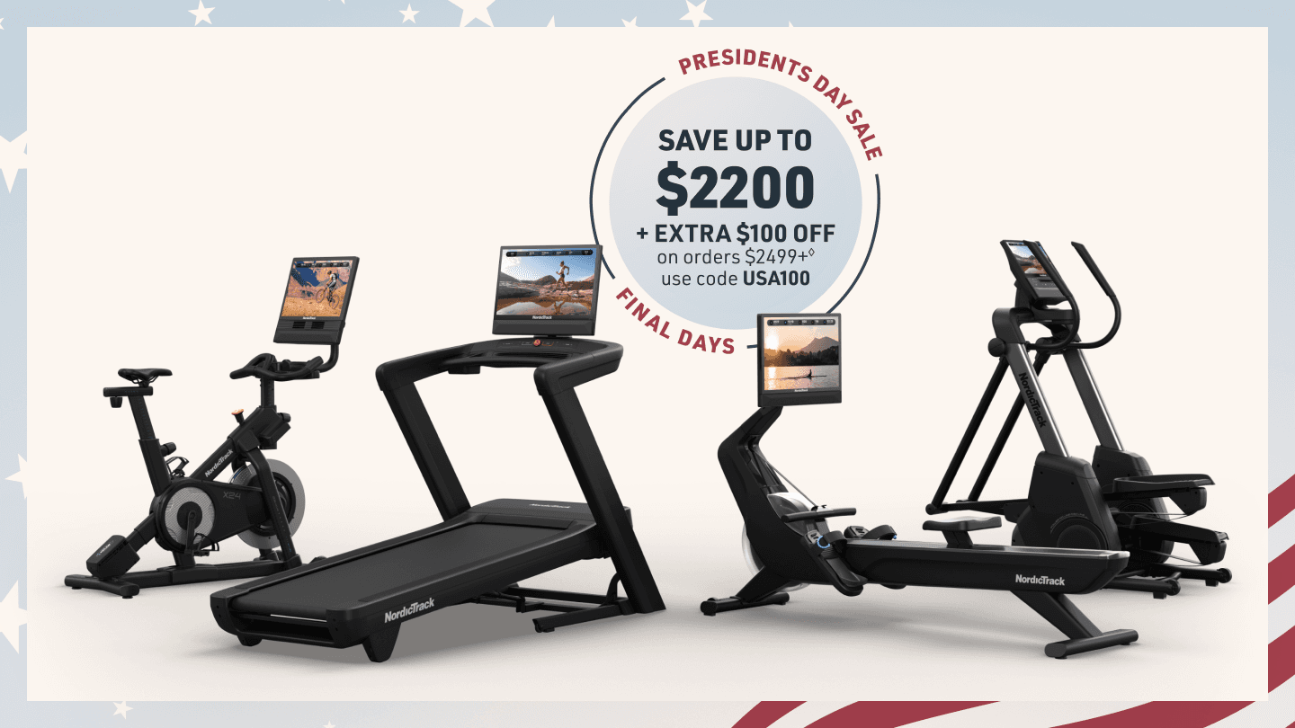 ◊ Extra $100 off orders $2,499+ (“Offer”) available only from February 17, 2026 until February 20, 2026 @ 11:59PM MST for U.S. residents, 18+. Discount only applies to the subtotal of order at Home and Exercise Equipment by NordicTrack - Treadmills, Ellipticals, and More and will not apply to taxes or shipping or other charges. Excludes Ultra Series Products. Offer is not transferable, substitutable, not redeemable for cash or account credit, has no cash value, and will not be applied retroactively. Void where prohibited. Must enter USA100 promo code at checkout to obtain discount. Limit one per customer. NordicTrack reserves the right to end, revise, modify, or extend this Offer or its terms at any time without notice. NordicTrack is not responsible for any Offer errors, including tech errors.
