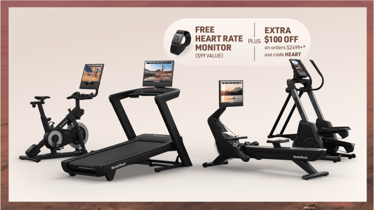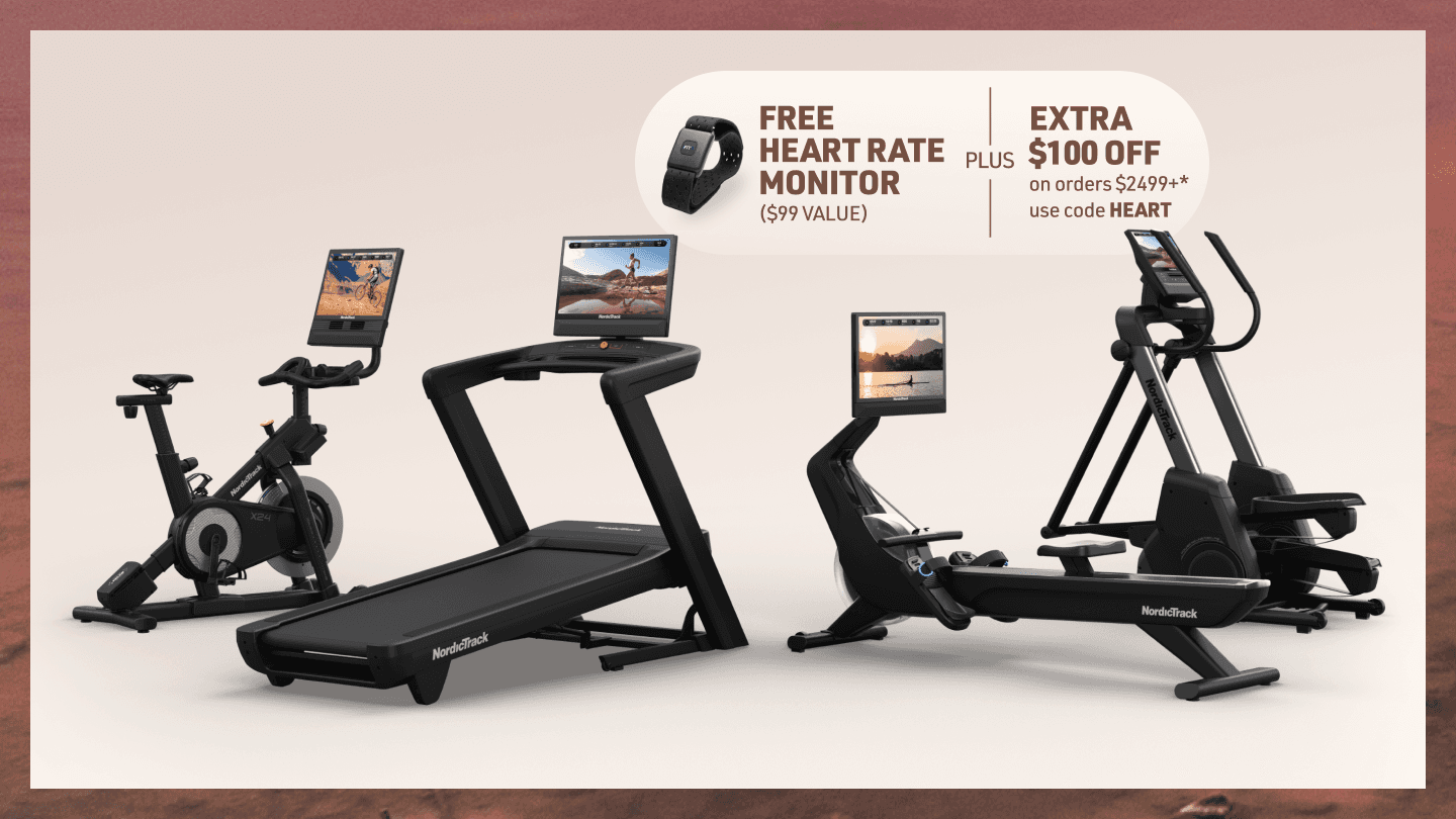 ◊ Free Heart Rate Monitor ($99 value) + Extra $100 off orders $2,499+ (“Offer”) available only from February 24, 2026 until March 2, 2026 @ 11:59 PM MST for U.S. residents, 18+. Extra $100 discount applies only to qualifying orders with a subtotal of $2,499 or more at Home and Exercise Equipment by NordicTrack - Treadmills, Ellipticals, and More and does not apply to taxes, shipping, or other charges. Free heart rate monitor is available on a first-come, first-served basis while supplies last. Retail value of free item: $99. Limit one (1) free item and one (1) discount per customer and per order. Excludes Ultra Series Products. Offer is not transferable, substitutable, or redeemable for cash or account credit, has no cash value, and will not be applied retroactively. Offer may not be combined with other promotions. Void where prohibited by law. Must enter promo code HEART at checkout to receive both the discount and free gift. NordicTrack reserves the right to end, revise, modify, or extend this Offer or its terms at any time without notice. NordicTrack is not responsible for any Offer errors, including technical errors.