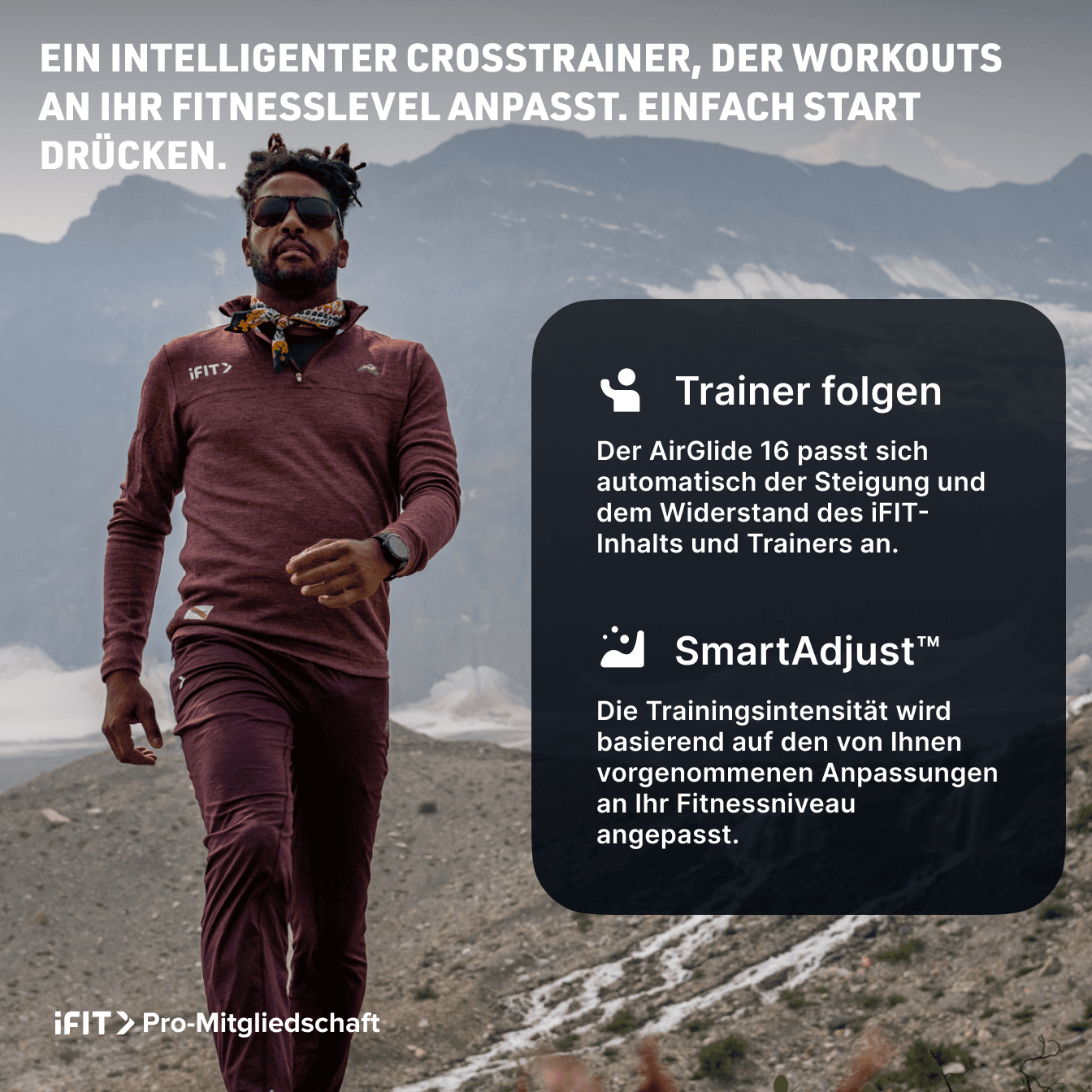 Der AirGlide 16 Crosstrainer passt automatisch die Steigung, die Neigung und den Widerstand des iFIT-Trainings an. SmartAdjust™ geht noch weiter und personalisiert jedes Training entsprechend Ihrem Fitnesslevel basierend auf den Anpassungen, die Sie vornehmen.