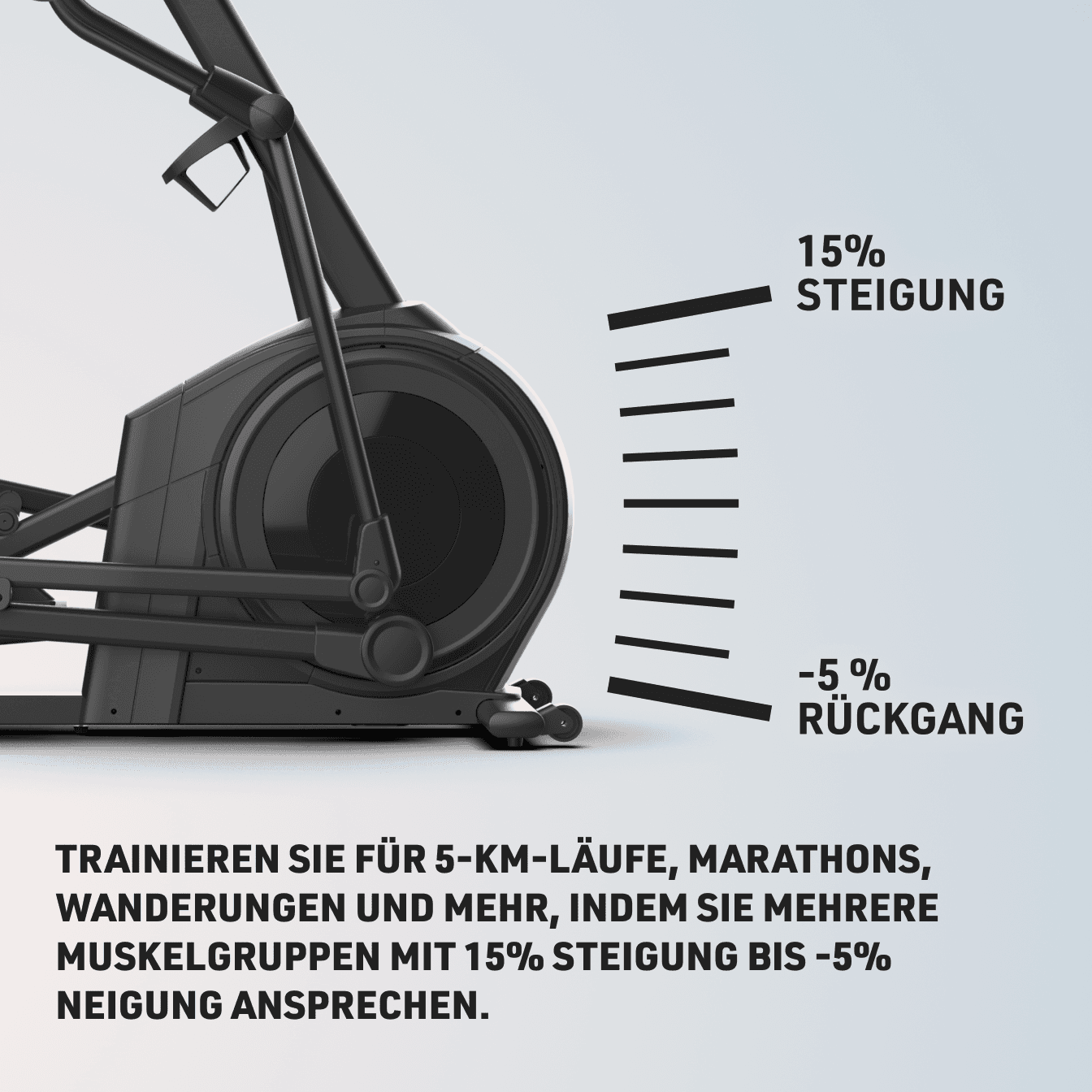 TRAINIEREN SIE FÜR DIE HÖHEN UND TIEFEN VON REALEM GELÄNDE MIT EINER 15%IGEN STEIGUNG UND -5%IGEN NEIGUNG. DIE PERFEKTE FUNKTION FÜR GELENKSCHONENDE WORKOUTS.