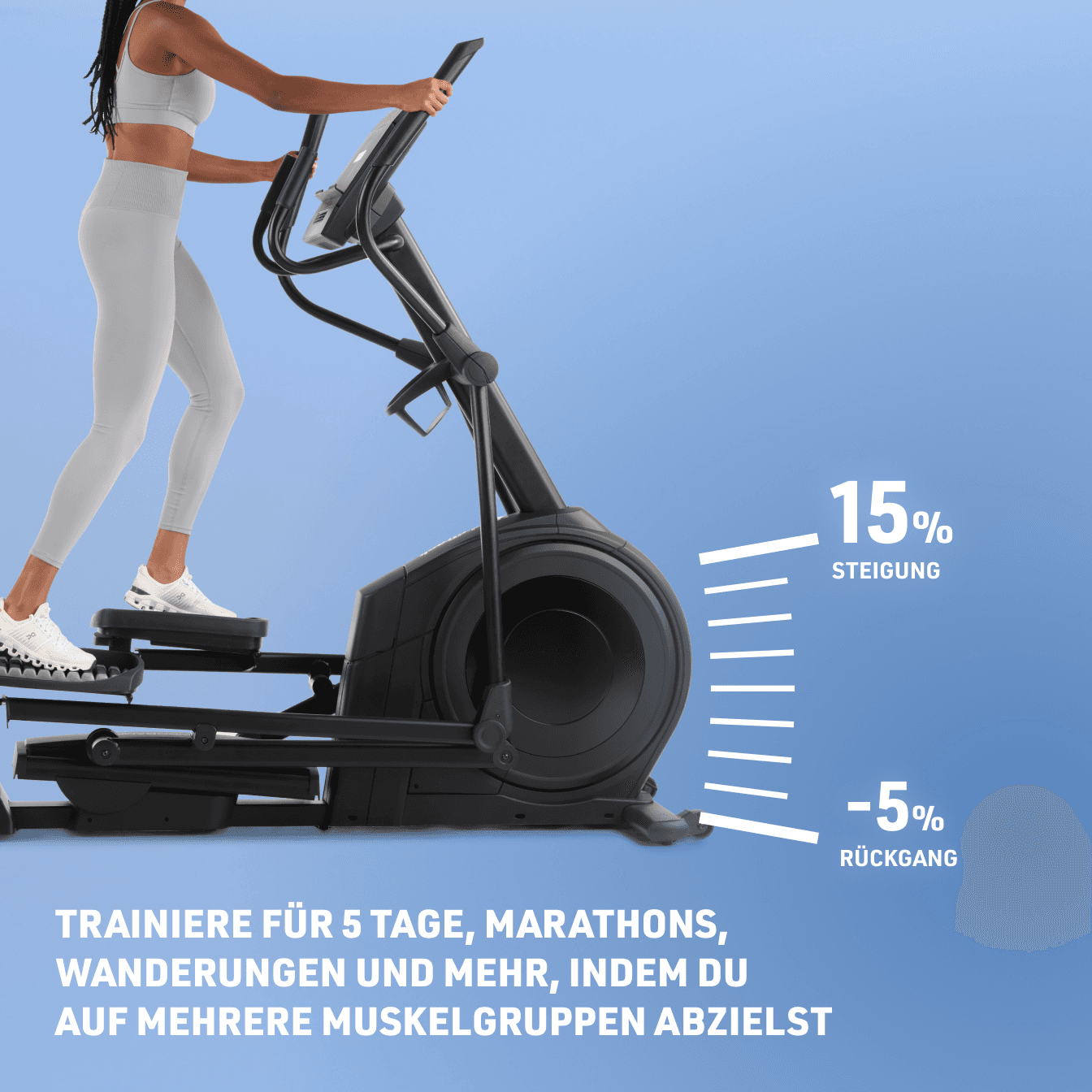 Trainieren Sie für die Höhen und Tiefen des realen Geländes mit einer Steigung von 15 % und einem Rückgang von -5 %. Die perfekte Funktion für Workouts mit geringer Belastung.