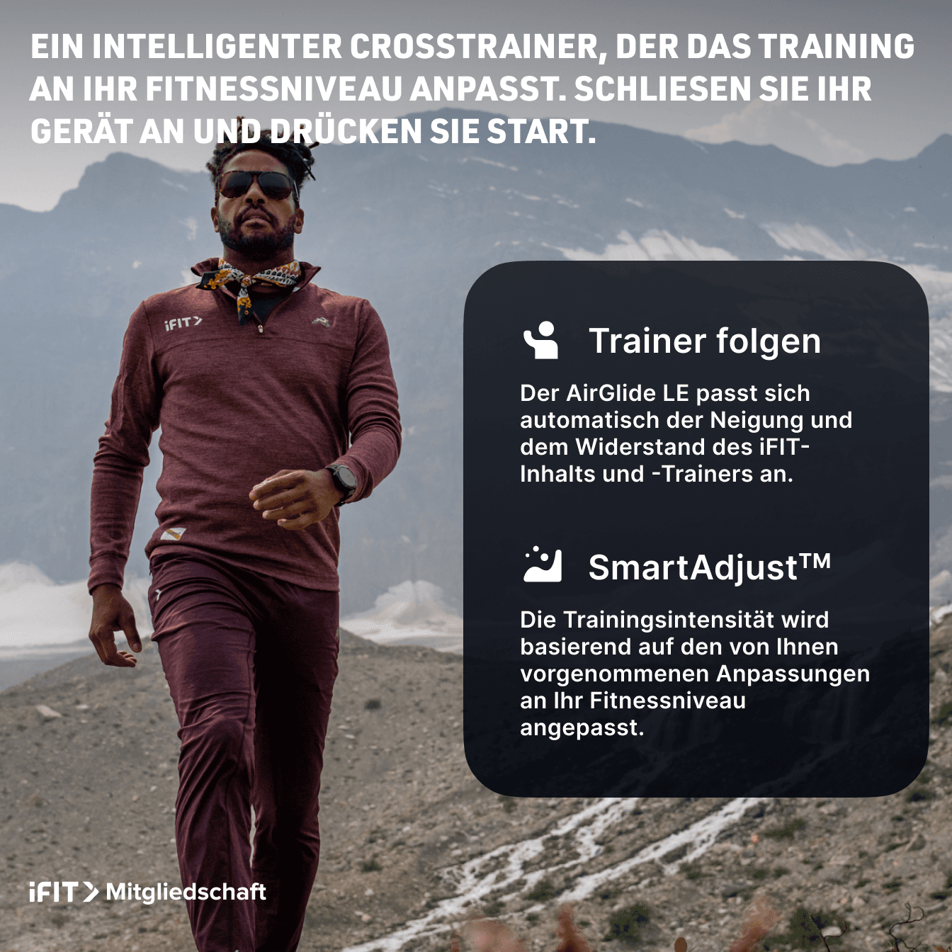 - iFIT Mitgliedschaft ist erforderlich, um auf alle Inhalte und Funktionen der Ausrüstung zugreifen zu können. Die 1-Jahr-Mitgliedschaft verlängert sich automatisch jährlich zum Preis von 396€. Die 2-Jahre- und die 3-Jahre-Mitgliedschaten verlängern sich monatlich zum Preis von 39€. Jederzeit kündbar. Die Monatmitgliedschaft verlängert sich automatisch, wenn sie nicht gekündigt wird.