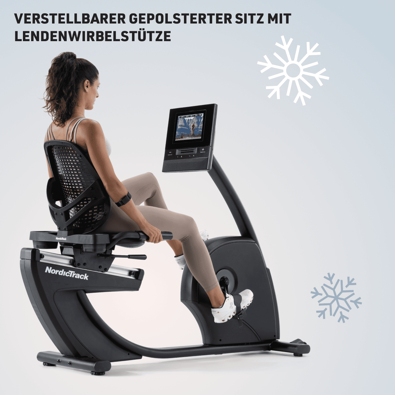 Bequemer Sitz während des Trainings. Ein gepolsterter Sitz mit Lendenwirbelstütze, der sich so einstellen lässt, dass Sie die Pedale leicht erreichen können.
