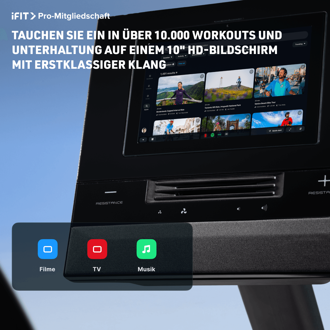 Mit iFIT haben Sie Zugriff auf Streaming-Dienste direkt auf dem 10'' HD-Touchscreen. Neigen Sie den Bildschirm für den perfekten Betrachtungswinkel und trainieren Sie zu Ihren Lieblingsfilmen, -shows und -musik.⁶