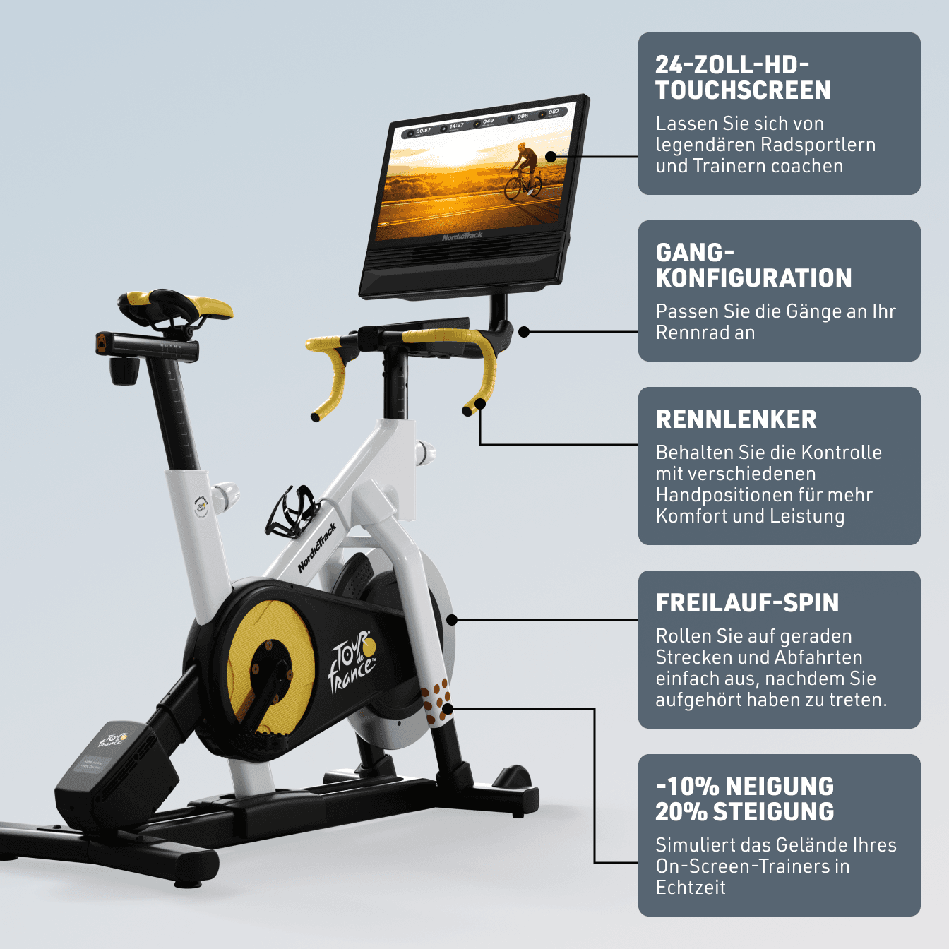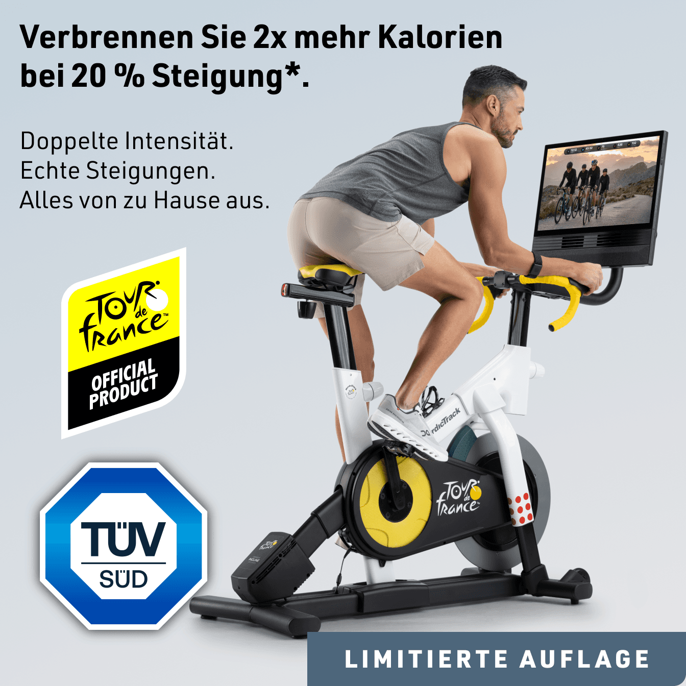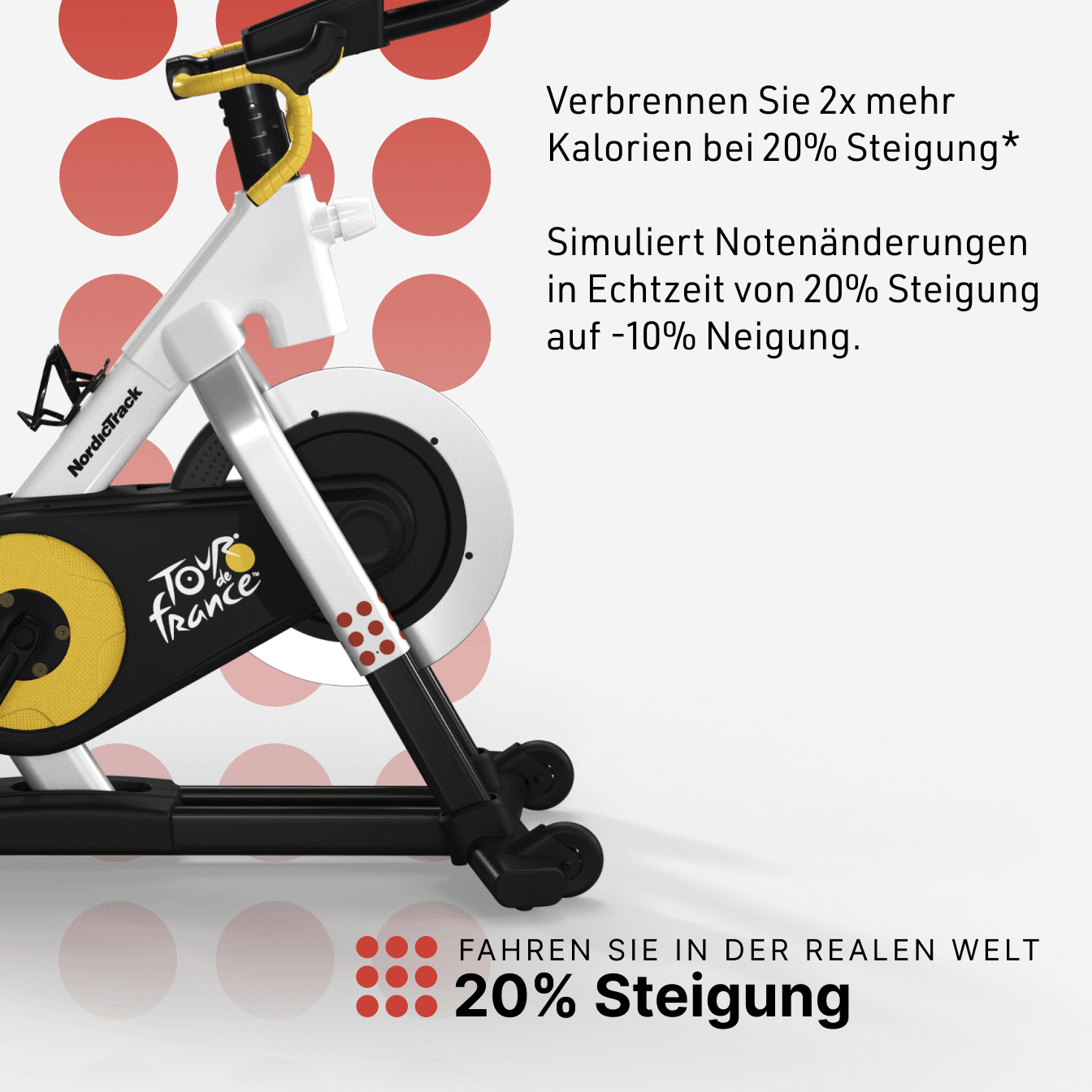Verbrennen Sie 2x mehr Kalorien bei 20 % Steigung*. Erleben Sie die gleiche körperliche Herausforderung wie bei echten Bergetappen: Spüren Sie die Kraft in Ihren Muskeln und den authentischen Widerstand bei jedem Tritt. Dank der extremen Steigung fordern Sie Ihren Körper mehr als je zuvor und erzielen maximale Ergebnisse in kürzerer Zeit.