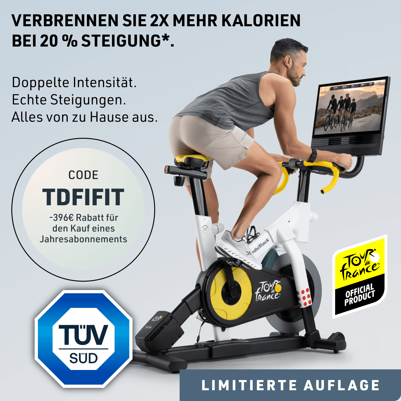 Verbrennen Sie 2x mehr Kalorien bei 20 % Steigung*. Erleben Sie die gleiche körperliche Herausforderung wie bei echten Bergetappen: Spüren Sie die Kraft in Ihren Muskeln und den authentischen Widerstand bei jedem Tritt. Dank der extremen Steigung fordern Sie Ihren Körper mehr als je zuvor und erzielen maximale Ergebnisse in kürzerer Zeit.