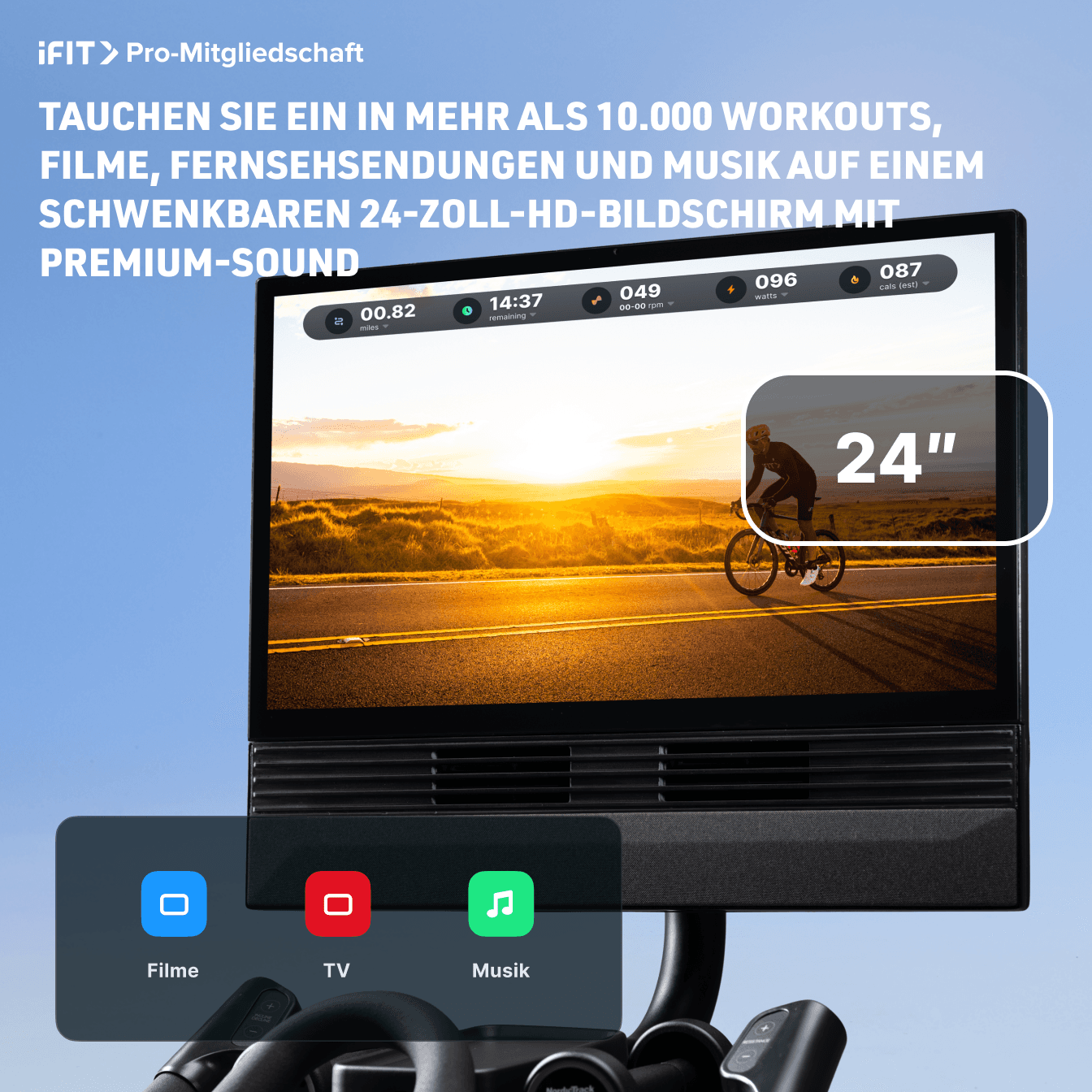 Mit iFIT haben Sie Zugriff auf Streaming-Dienste direkt auf dem 24'' HD-Touchscreen. Schwenken und neigen Sie den Bildschirm für den perfekten Betrachtungswinkel und trainieren Sie zu Ihren Lieblingsfilmen, -shows und -musik.⁶