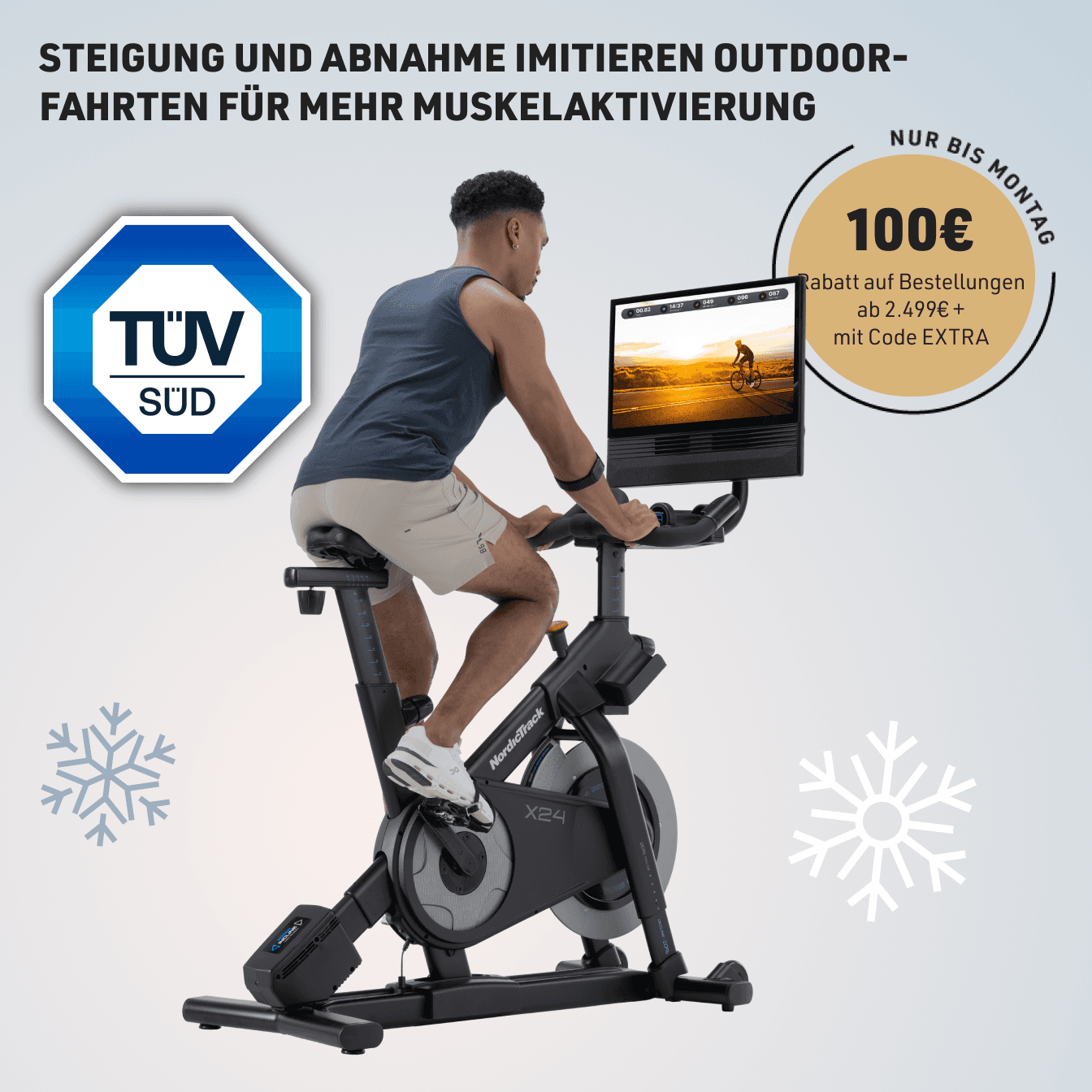 Trainiere für Hügel, Wohnungen und Abfahrten. Das ist Indoor-Cycling, das Sie auf die reale Welt vorbereitet. Tauchen Sie in Kombination mit iFIT in atemberaubende Workouts auf der ganzen Welt ein.