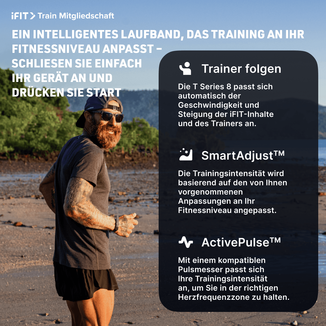 Verbinden Sie Ihr Gerät und tauchen Sie ein in von Trainern geleitete Workouts und Streaming mit iFITDas intelligente Laufband der T Series 8 passt sich Ihnen an. Drücken Sie einfach Start und iFIT erledigt den Rest.¹