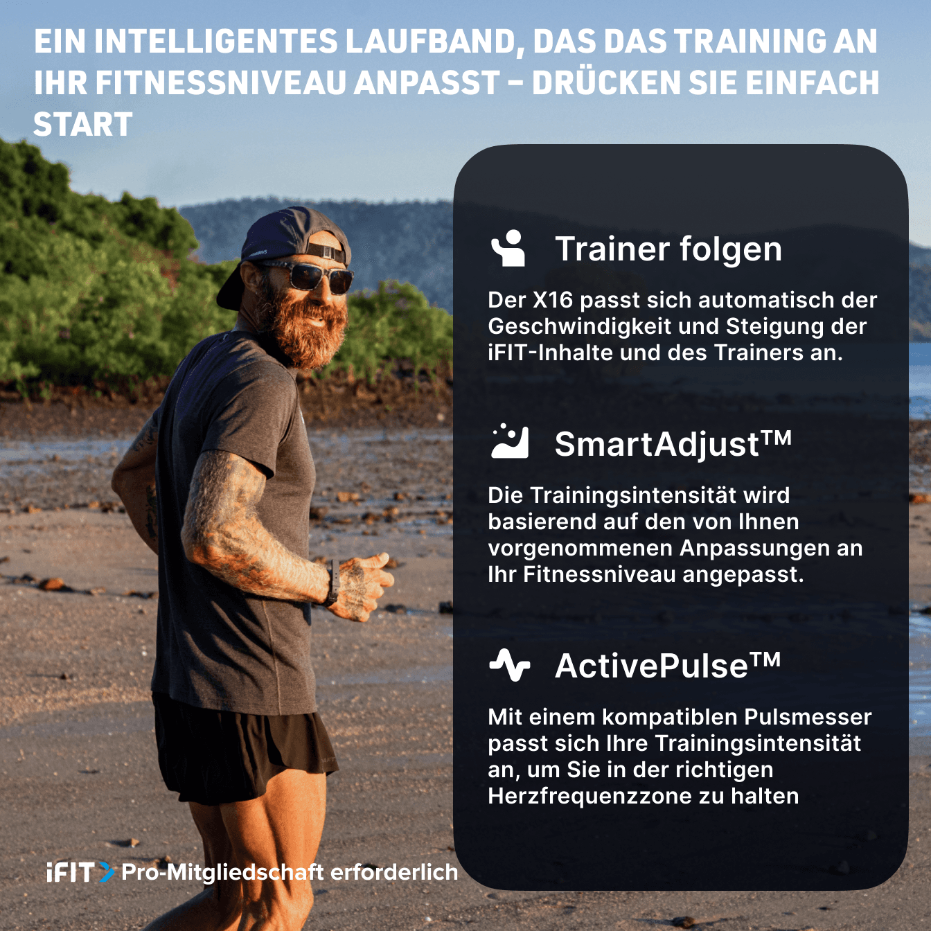 16" schwenkbarer Touchscreen für Trainer-geführte Workouts & Streaming mit iFITDas X16 Smart Laufband passt sich Ihnen an. Drücken Sie einfach Start und iFIT erledigt den Rest.¹