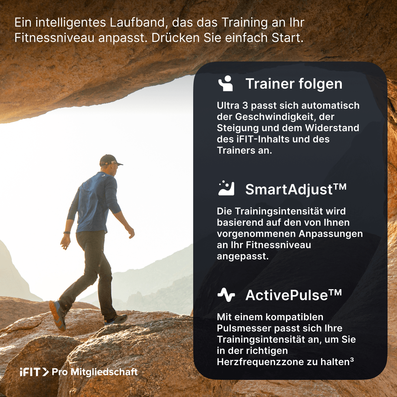 Ultra 3 passt sich automatisch der Steigung, der Neigung und der Geschwindigkeit des iFIT-Trainings an. SmartAdjust™ geht noch einen Schritt weiter und personalisiert jedes Training auf Ihr Fitnessniveau basierend auf den Anpassungen, die Sie vornehmen.¹