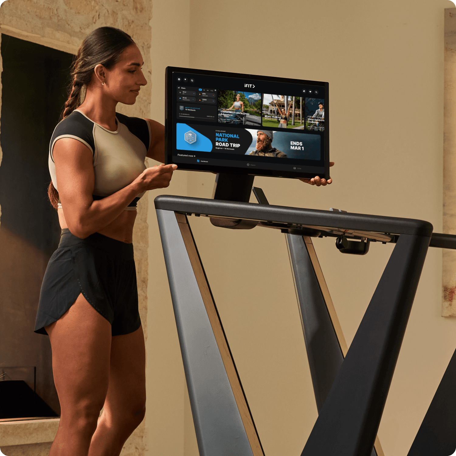 Drehen Sie den Bildschirm, um Ihr Training immer zu sehen. Folgen Sie den erfahrenen iFIT Trainern bei Trainingseinheiten abseits des Laufbands, einschließlich Krafttraining, Yoga, HIIT und mehr.