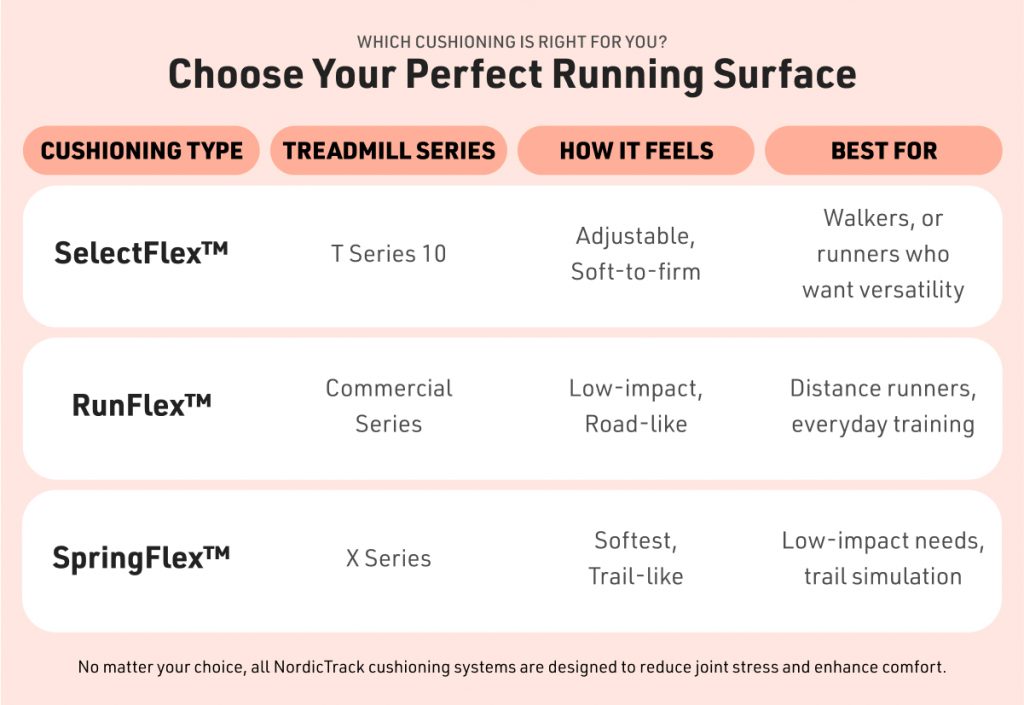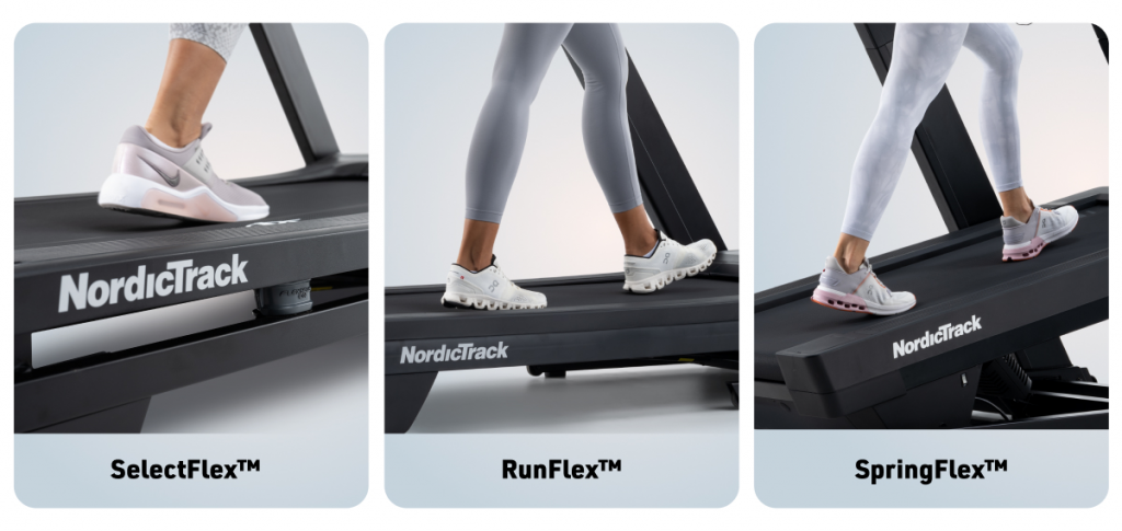 NordicTrack ofrece sistemas de plataforma para que elijas la sensación que quieres en cada carrera: más firme para una sensación similar a la carretera o más suave para días de recuperación, sin cambiar tu plan de entrenamiento.