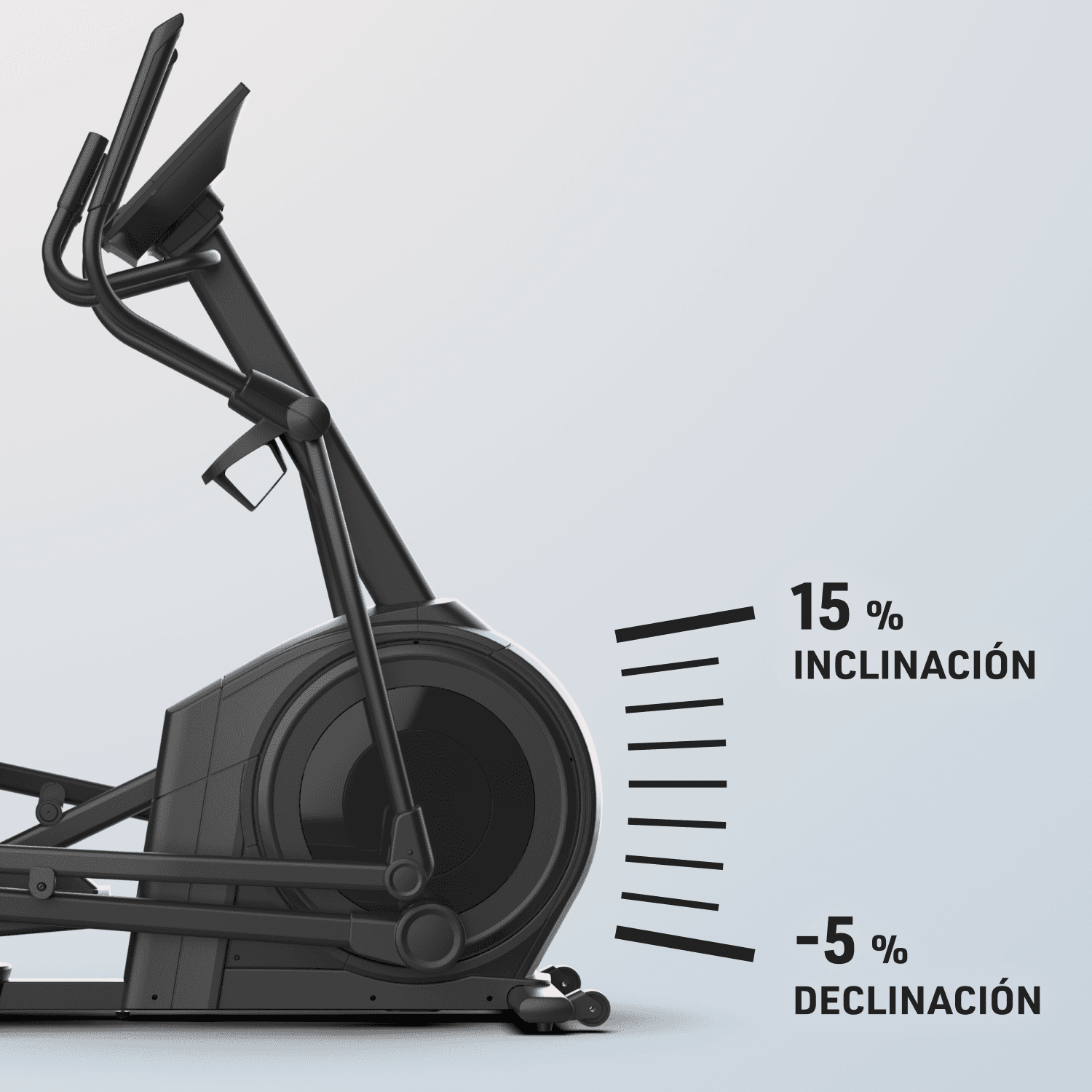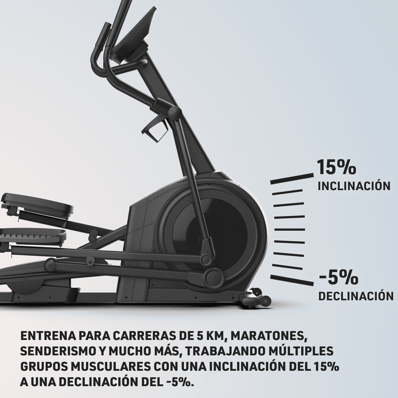 ENTRENA PARA LAS SUBIDAS Y BAJADAS DEL MUNDO REAL CON UNA INCLINACIÓN DEL 15% Y UNA DECLINACIÓN DEL -5%. LA CARACTERÍSTICA PERFECTA PARA ENTRENAMIENTOS DE BAJO IMPACTO.