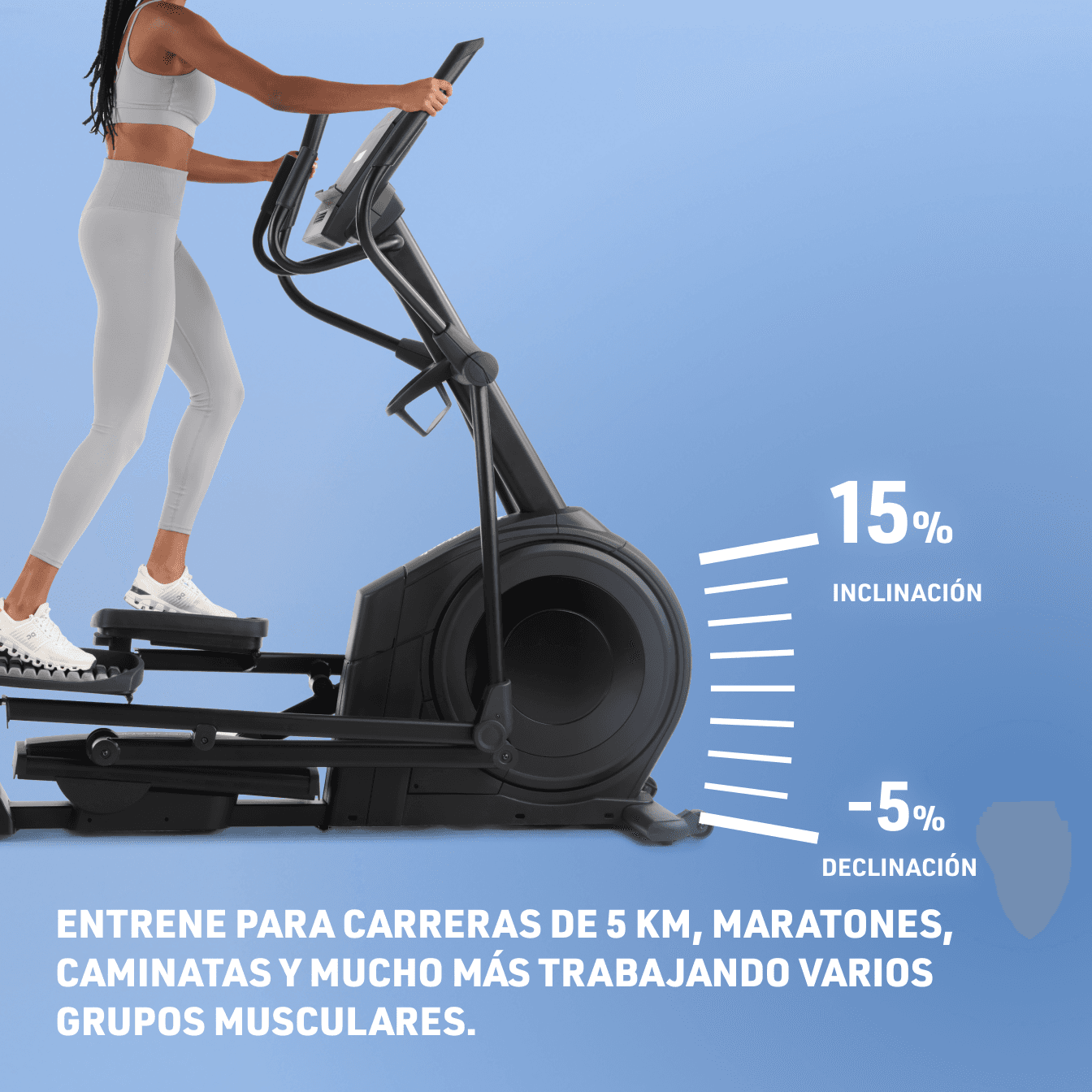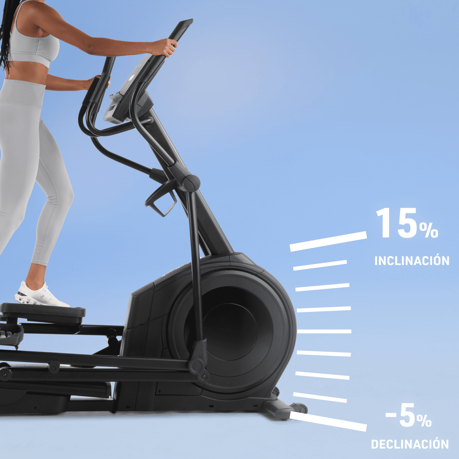 Sigue el terreno real y la intensidad de tu entrenamiento iFIT con la inclinación que ofrece esta elíptica, desde una declinación de -5% hasta una inclinación de 15%.
