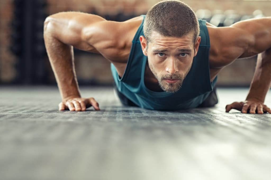 • Les pompes : le poids soutenu par les mains à plat sur le sol et la pointe des pieds, abaissez et soulevez votre corps à la force des bras. Avec les coudes près des côtes, vous sollicitez beaucoup les triceps, avec les coudes écartés à 45°, les pectoraux. En revanche, évitez absolument de dépasser 45° pour ne pas vous blesser. Si vous ne parvenez pas à réaliser des pompes classiques, testez les pompes sur les genoux, plus accessibles pour les débutants.
