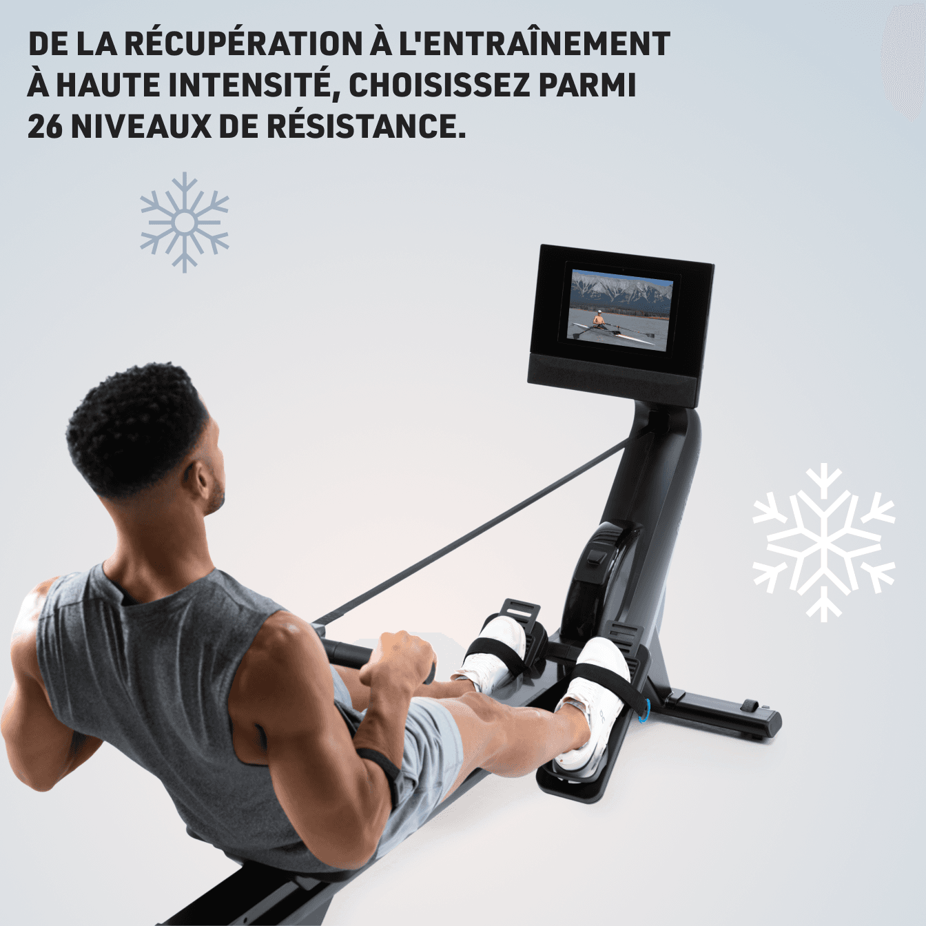 Pédales larges avec sangles réglables qui s'adaptent à la plupart des tailles de chaussuresLe rameur intelligent RW700 s'adapte à vos besoins. Appuyez simplement sur le bouton de démarrage et iFIT s'occupe du reste.¹