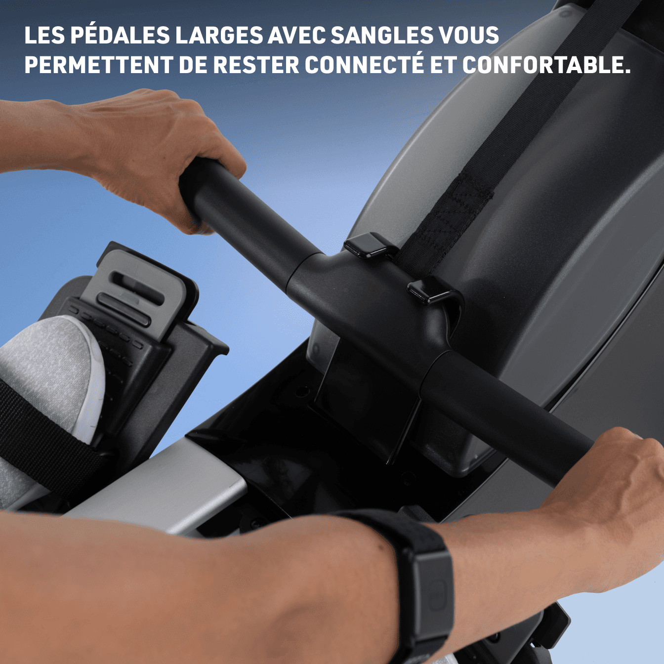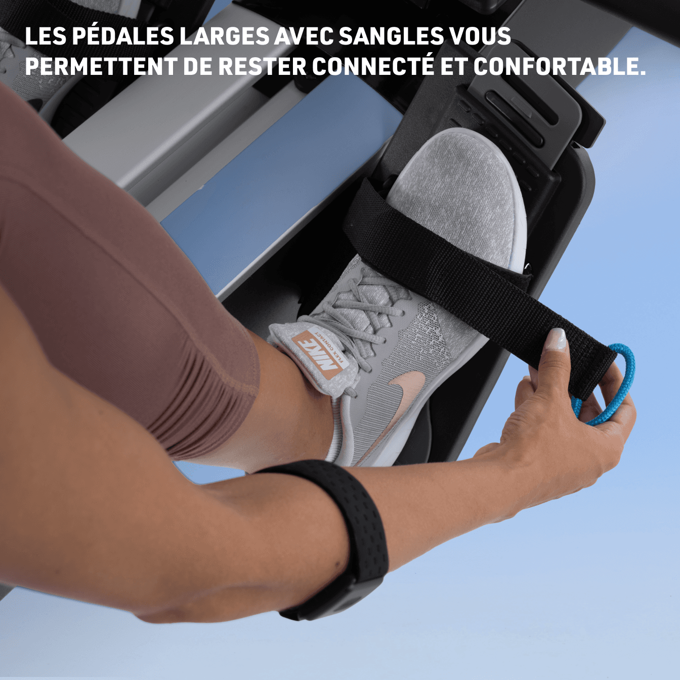 Pédales larges avec sangles réglables qui s'adaptent à la plupart des tailles de chaussuresLe rameur intelligent RW900 s'adapte à vos besoins. Appuyez simplement sur le bouton de démarrage et iFIT s'occupe du reste.¹