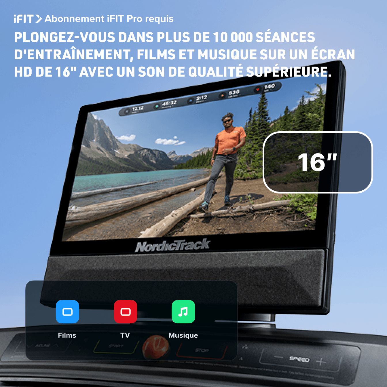 Avec iFIT, vous avez accès à des services de streaming directement sur l'écran tactile HD de 16''. Pivotez et inclinez l'écran pour obtenir l'angle de vue idéal, et entraînez-vous avec vos films, émissions et musiques préférés.⁶