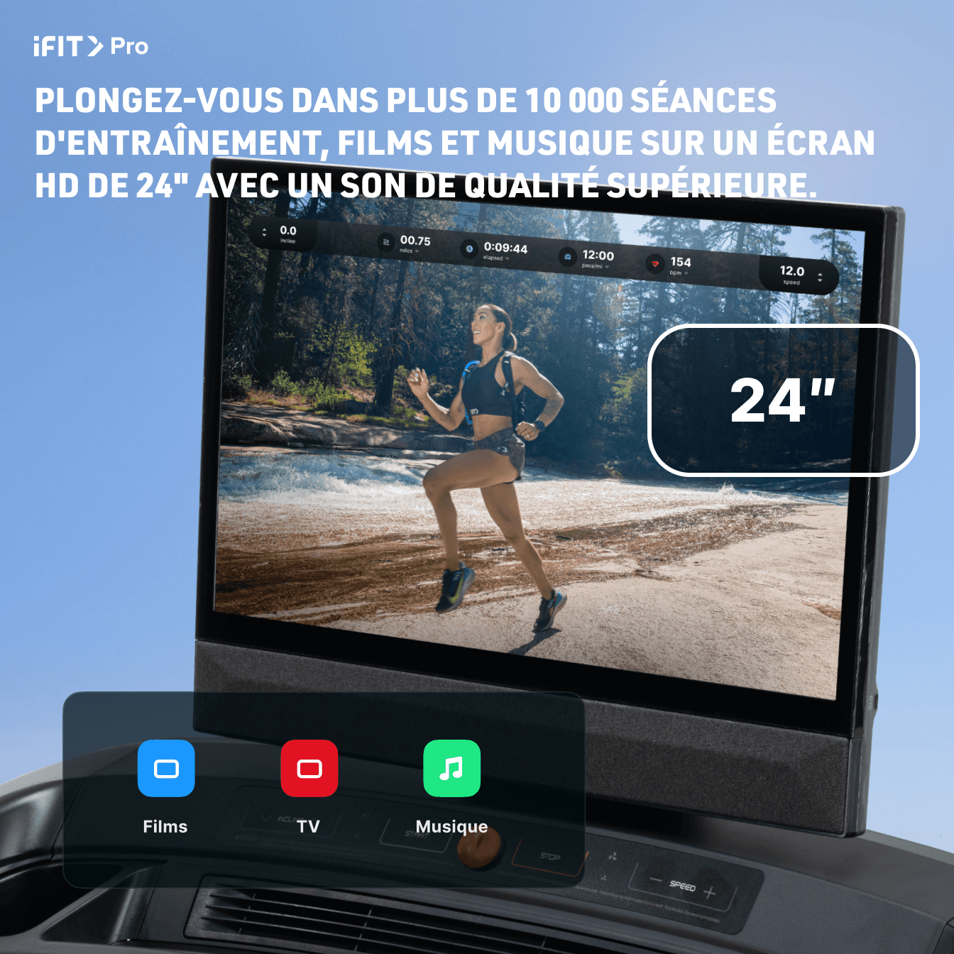 Avec iFIT, vous avez accès à des services de streaming directement sur l'écran tactile HD de 24''. Pivotez et inclinez l'écran pour obtenir l'angle de vision parfait, et entraînez-vous avec vos films, émissions et musiques préférés.⁶