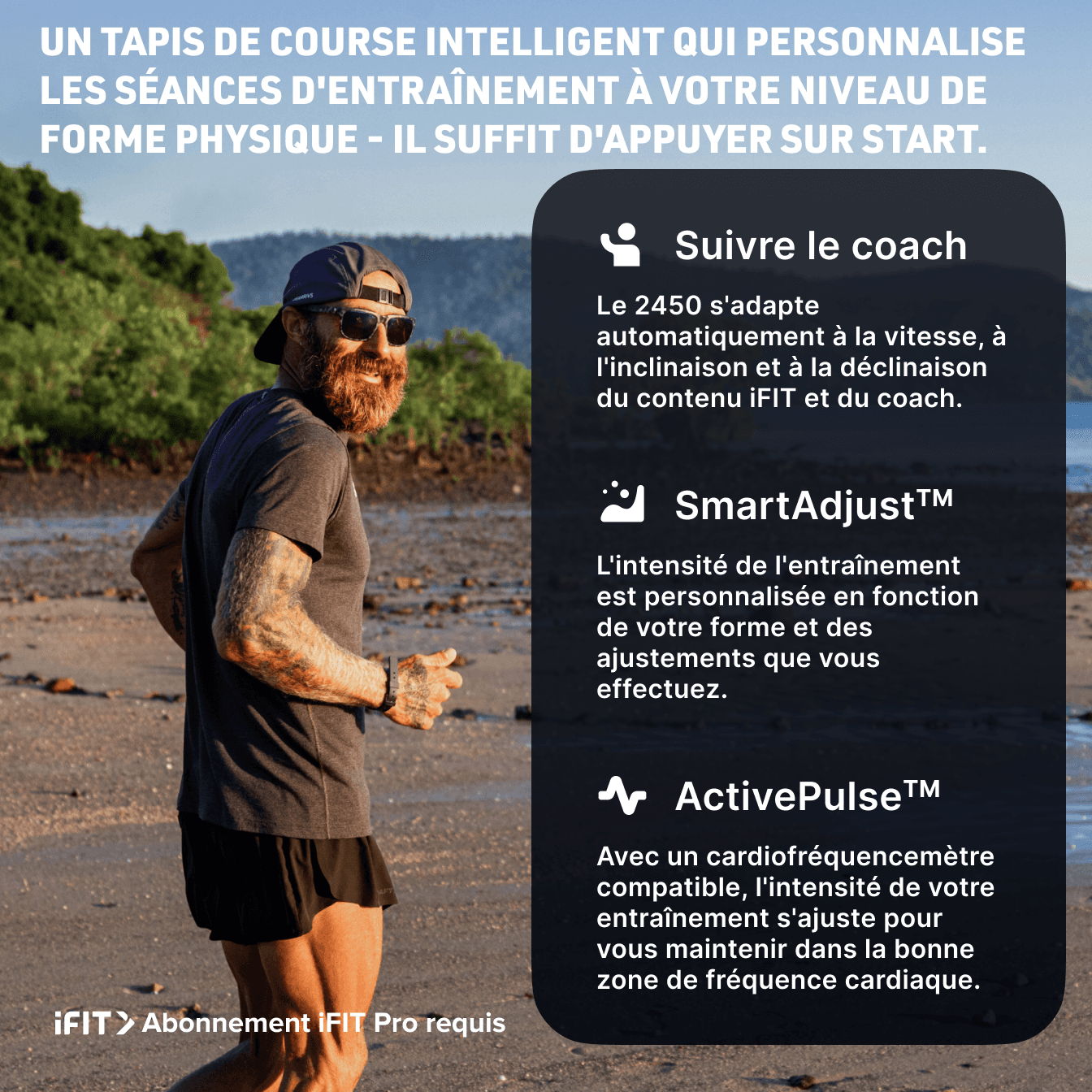 8. Abonnement iFIT et capteur de fréquence cardiaque compatible requis (vendus séparément). Disponible uniquement avec les tapis de course.