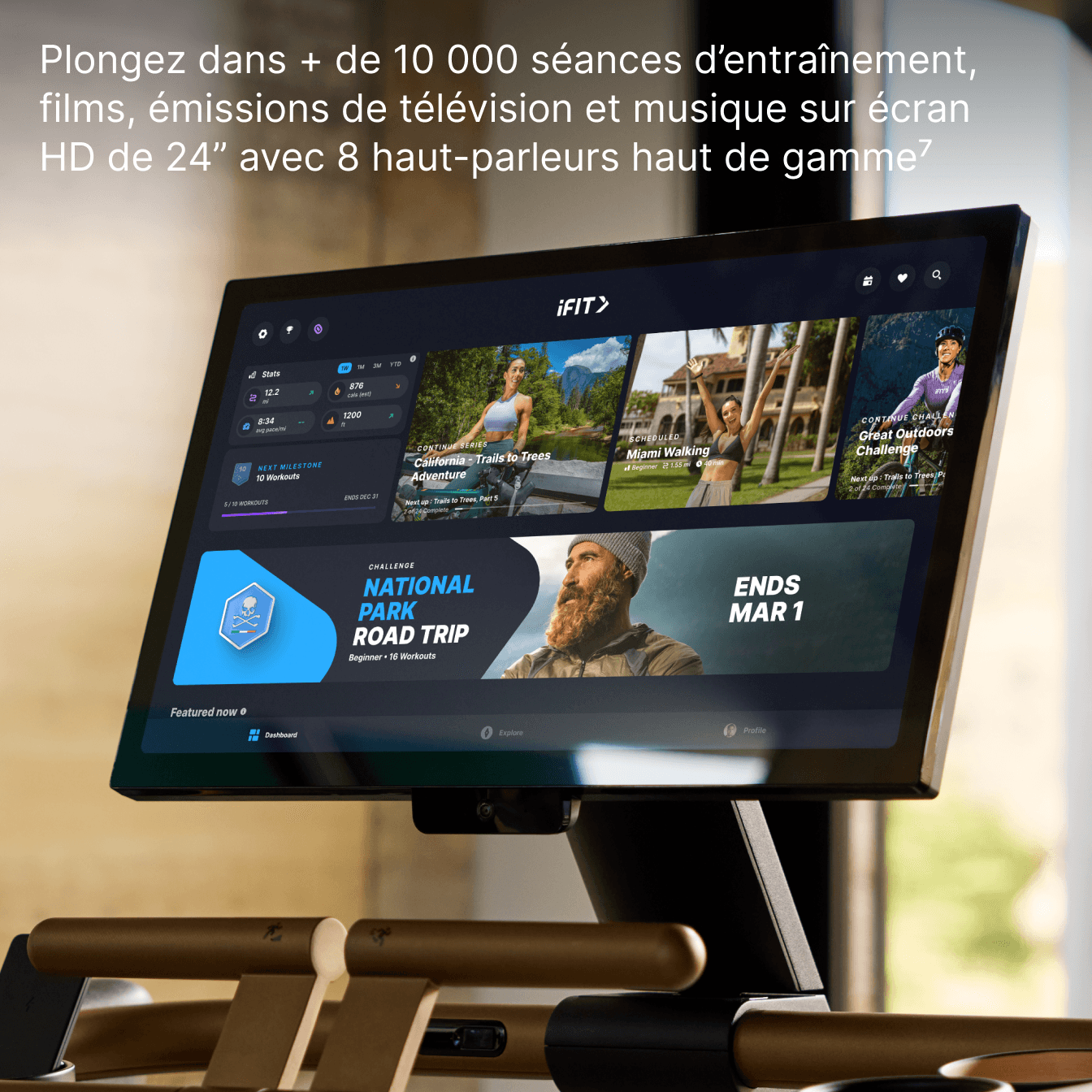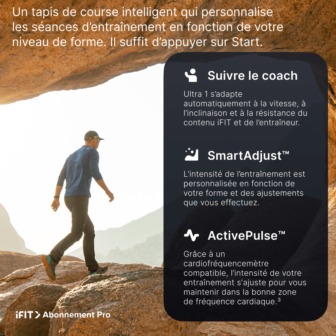 - Abonnement iFIT et moniteur de fréquence cardiaque compatible requis (vendus séparément). Disponible seulement avec des tapis de course.
