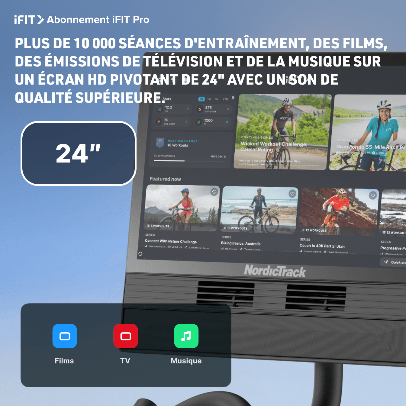 Avec iFIT, vous avez accès à des services de streaming directement sur l'écran tactile HD de 24". Pivotez et inclinez l'écran pour obtenir l'angle de vue idéal, et entraînez-vous avec vos films, émissions et musiques préférés.⁶