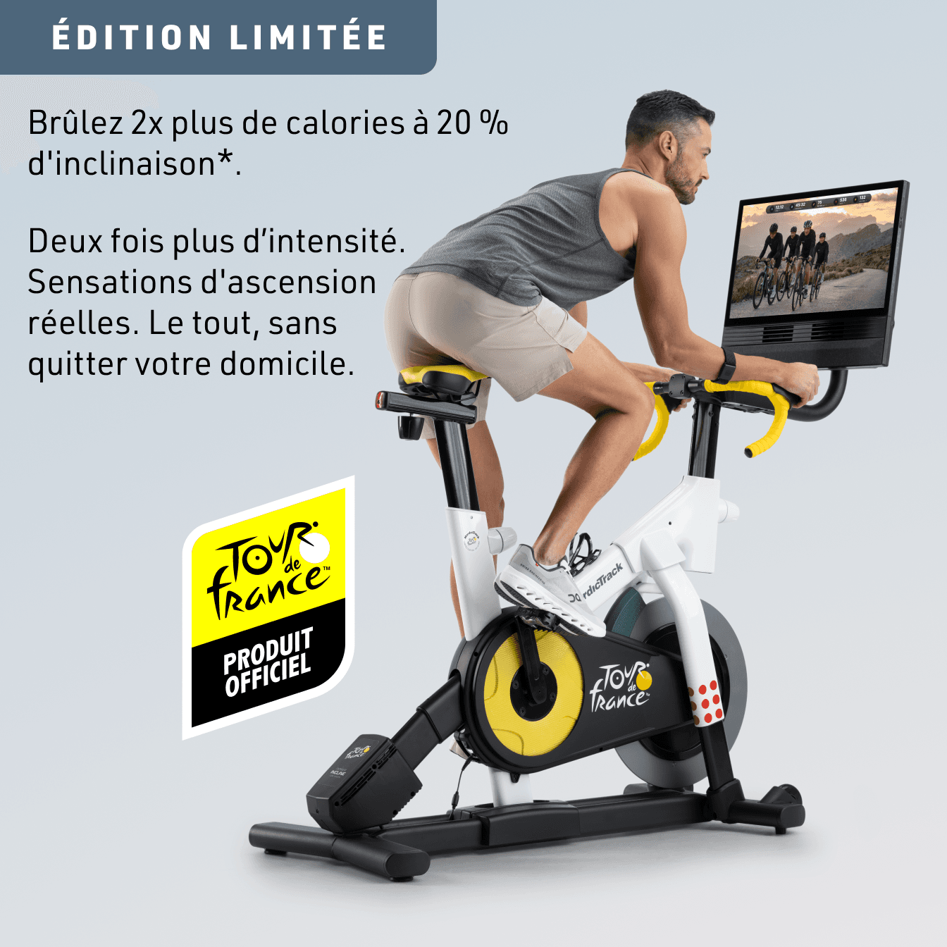 Brûlez 2× plus de calories à 20 % d’inclinaison*. Retrouvez la même charge physiologique que lors d’une ascension réelle grâce à un couple supérieur, un engagement musculaire plus profond et une résistance authentique que vous ressentirez à chaque coup de pédale.