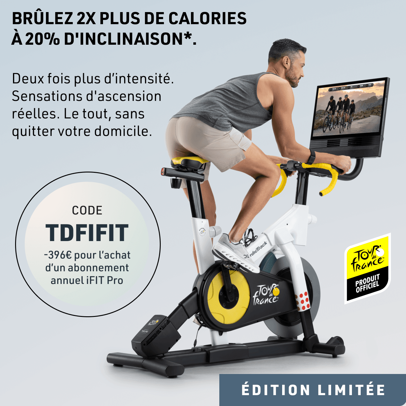 Brûlez 2× plus de calories à 20 % d’inclinaison*. Retrouvez la même charge physiologique que lors d’une ascension réelle grâce à un couple supérieur, un engagement musculaire plus profond et une résistance authentique que vous ressentirez à chaque coup de pédale.
