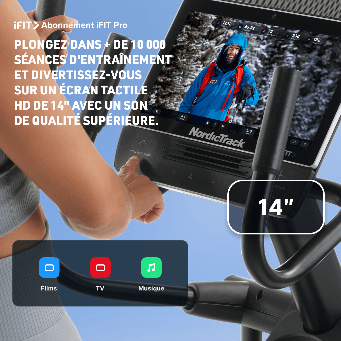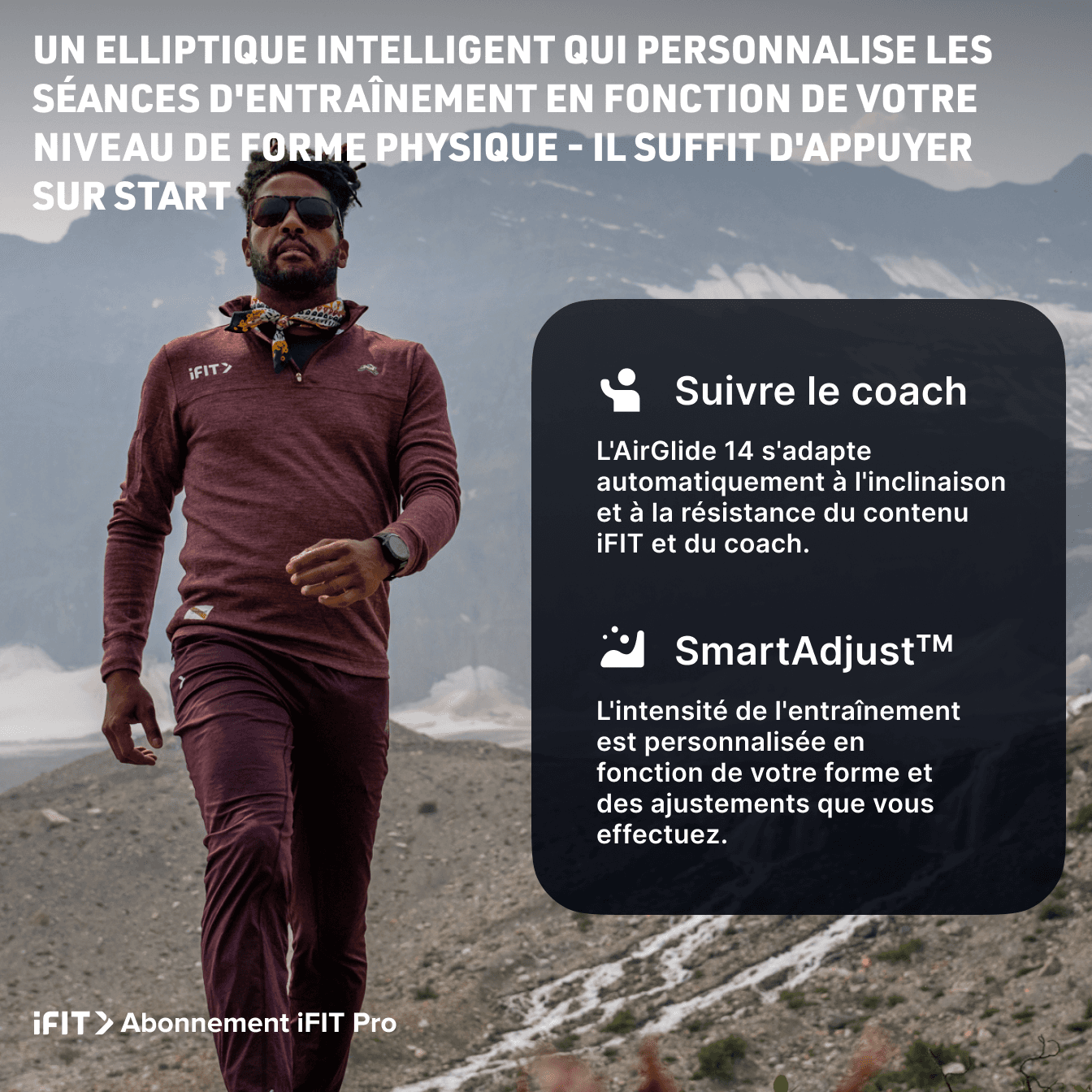 - Abonnement iFIT Pro (ou iFIT Train pour les appareils ne disposant pas de console tactile) requis pour accéder à l'ensemble du contenu et des caractéristiques de l'équipement. WiFi nécessaire. Carte de crédit nécessaire pour l'activation. L'abonnement 1 an se renouvelle automatiquement annuellement au prix de 396€. Les abonnements 2 ans et 3 ans se renouvellent mensuellement à 39€ sauf annulation préalable. L'abonnement mensuel se renouvelle automatiquement sauf annulation. Annulable à tout moment. Renouvellement automatique de l'abonnement iFIT Train (15€/mois). iFIT Train fonctionne uniquement sur smartphone ou tablette pour profiter d'iFIT sur votre équipement ne disposant pas d'un écran tactile. Annulable à tout moment.