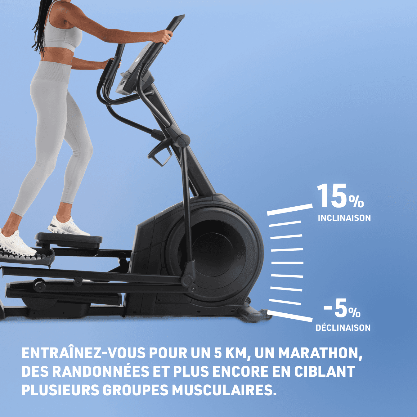 Suivez le terrain réel et l'intensité de votre entraînement iFIT grâce au système d’inclinaison et déclinaison de -5 % à 15 %.