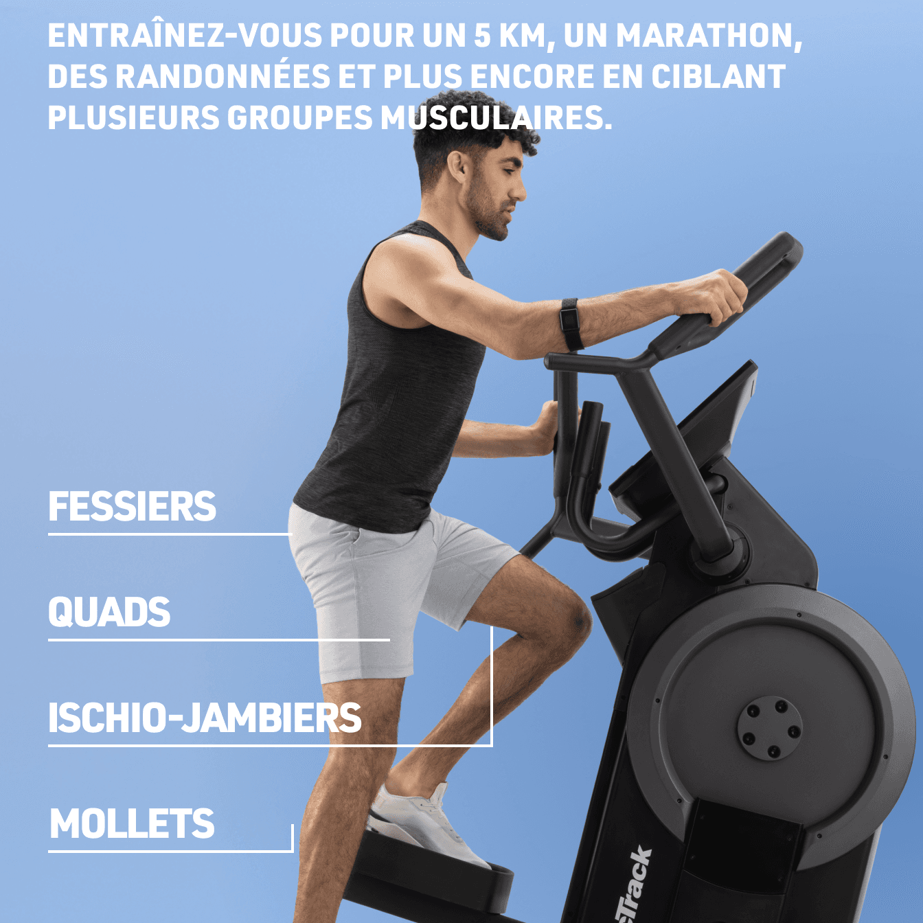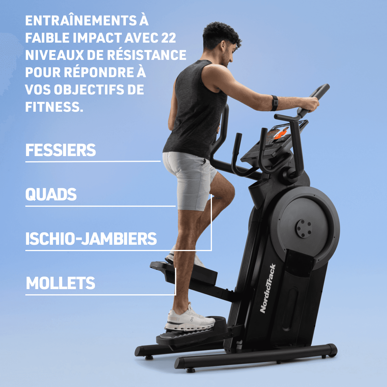 Grimpez vers de nouveaux sommets grâce à des entraînements à faible impact simulant la montée d'escaliers. Renforcez le bas du corps avec 22 niveaux de résistance pour une activation optimale des fessiers et des quadriceps. Avec iFIT, plongez dans des séances incroyables autour du monde, sur notre écran tactile de 16''.
