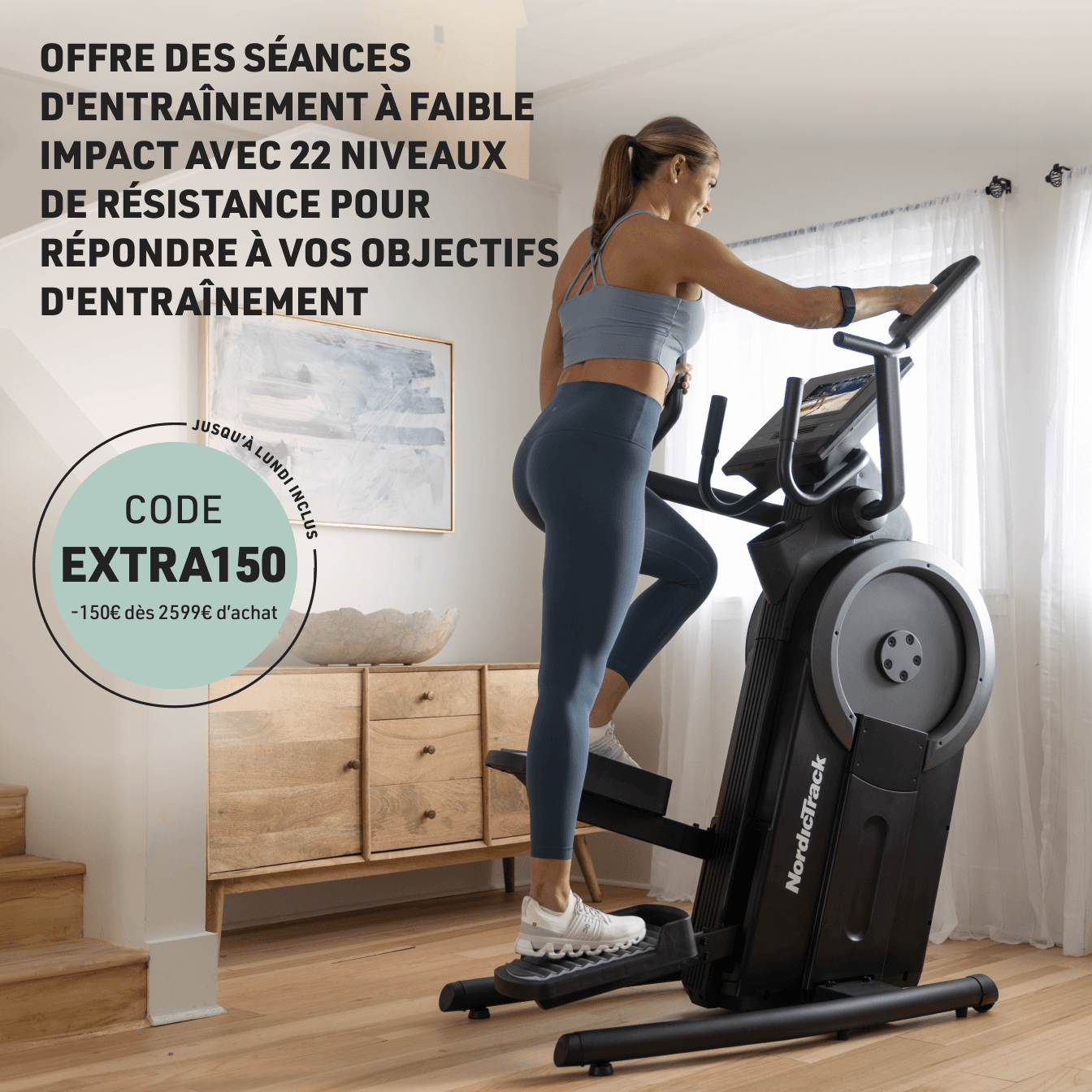 Grimpez vers de nouveaux sommets grâce à des entraînements à faible impact simulant la montée d'escaliers. Renforcez le bas du corps avec 22 niveaux de résistance pour une activation optimale des fessiers et des quadriceps. Avec iFIT, plongez dans des séances époustouflantes aux quatre coins du monde sur notre écran tactile de 10”.