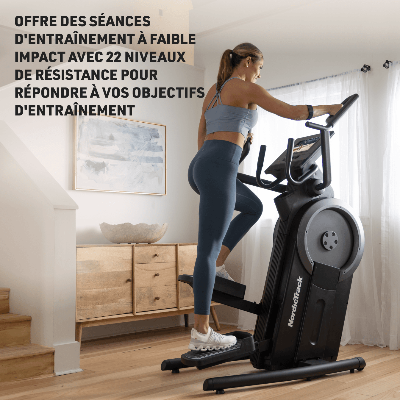 Grimpez vers de nouveaux sommets grâce à des entraînements à faible impact simulant la montée d'escaliers. Renforcez le bas du corps avec 22 niveaux de résistance pour une activation optimale des fessiers et des quadriceps. Avec iFIT, plongez dans des séances époustouflantes aux quatre coins du monde sur notre écran tactile de 10”.